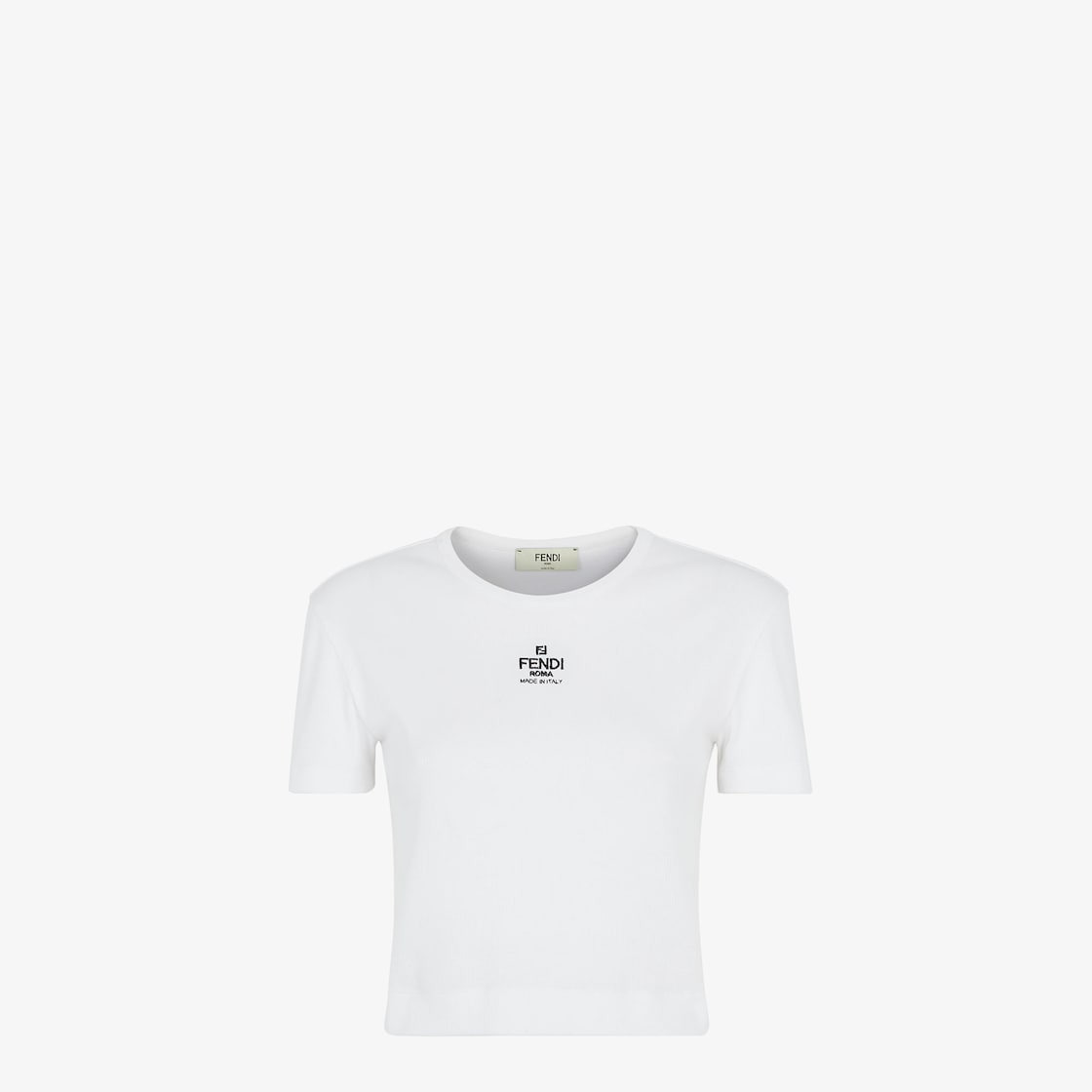 Cropped slim-fitting top with crew neck and short sleeves. Made of white cotton rib-knit jersey. Customized with a small contrasting “FENDI ROMA MADE IN ITALY” logo print on the front. Made in Italy Composition: 94% cotton, 6% elastane, decoration: 100% cotton Fit: Slim Product Code: FS8110ANQMF0ZNM