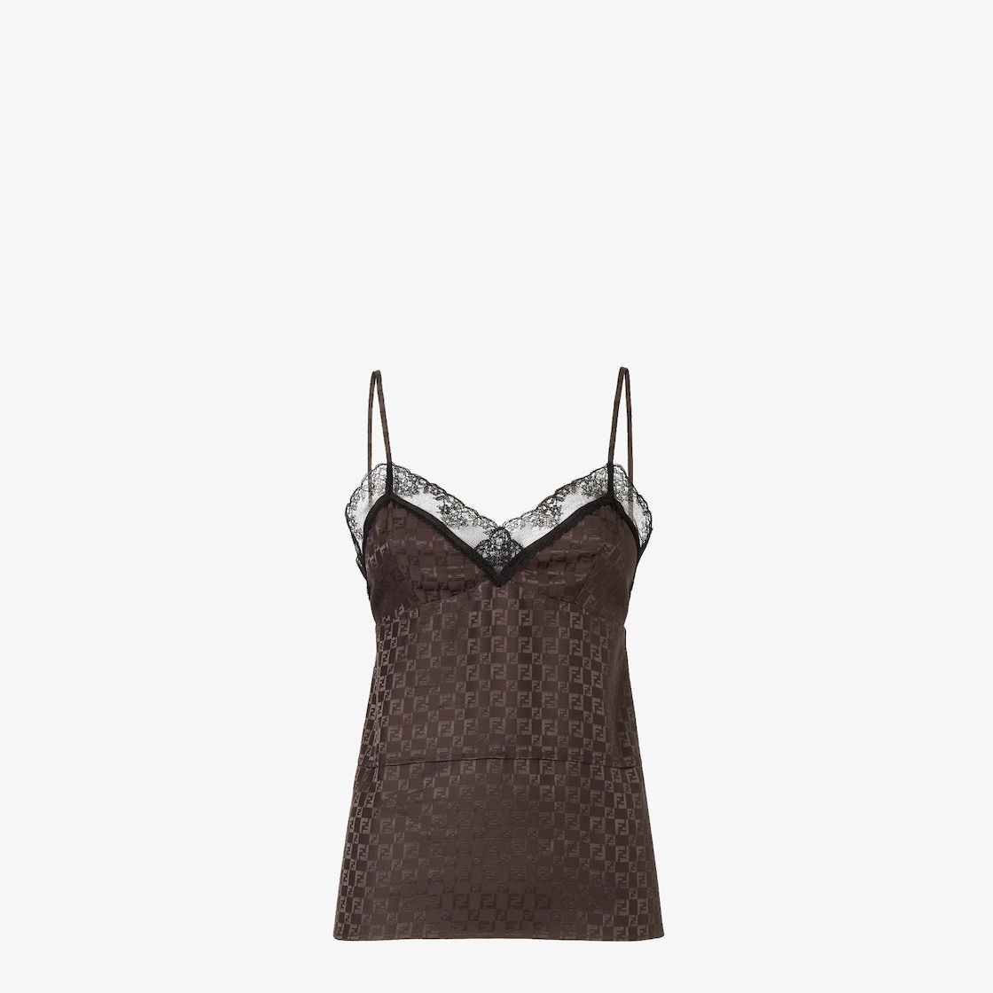 Sleeveless top with sweetheart neckline and thin shoulder straps. Made of jacquard silk with an iconic dark brown checkered FF motif. Finished with black lace detailing on the neckline. Made in Italy Composition: 100% silk, 88% cotton, 12% polyamide Size worn: 38 IT. The model is 180 cm tall Product Code: FS9753AUQGF1T6H