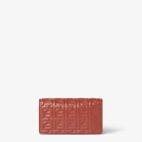 Compact Baguette wallet with flap and FF clasp. Interior compartment with six card slots. Double shoulder strap, an adjustable leather option and a detachable thin chain option: to carry the bag like a clutch, under the arm or wear it cross-body. Made of soft, sienna brown nappa leather with a 3D-effect embossed iconic FF motif. Gold-finish metalware. Made in Italy Composition: 100% lamb leather, inside: 100% lamb leather Product Code: 8M0498AAJDF1S4E