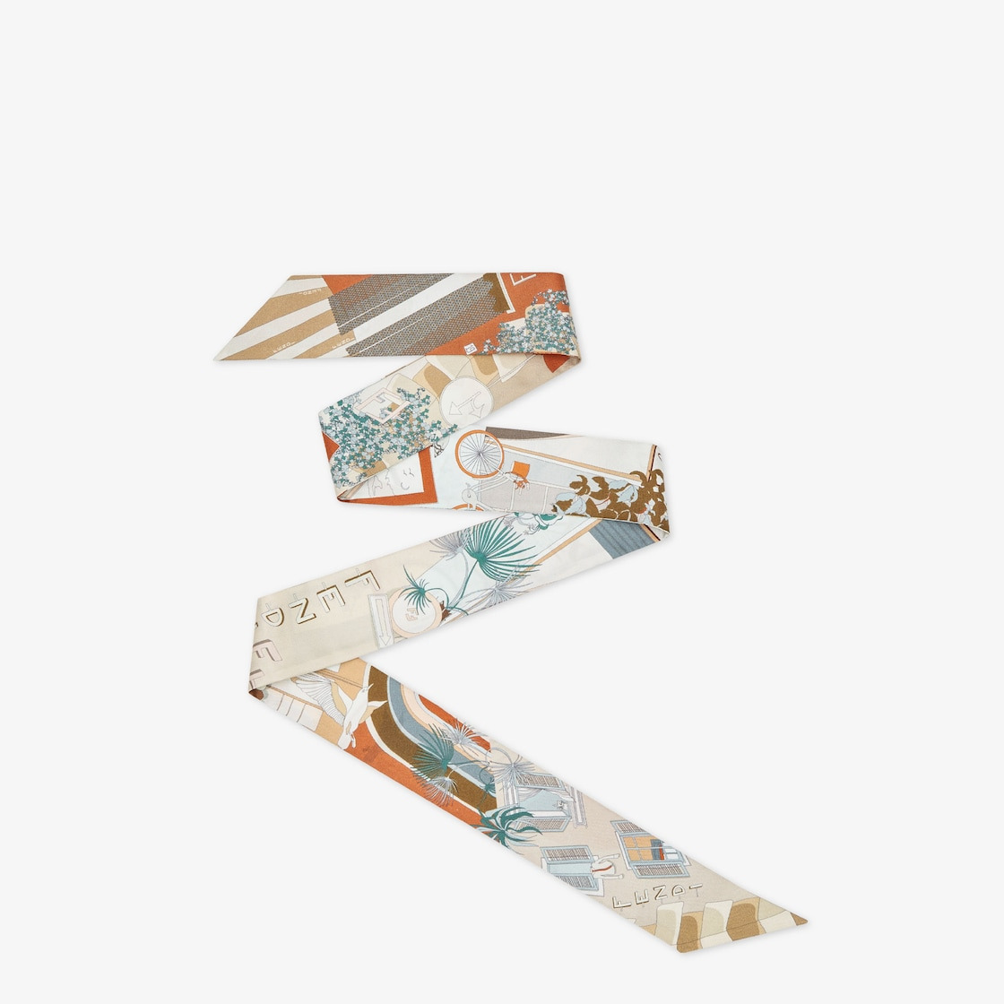 Two-sided wrappy. Can be worn around the neck, knotted at the wrist or used to accessorize a bag with a touch of color. Made of silk with the “Walking around Rome” motif, inspired by the historic districts of Rome. A graphic design that blends iconic brand elements with nods to tradition, featuring a mix of orange, green and beige tones. Made in Italy Composition: 100% silk Product Code: FXT011AUMAF1FU2
