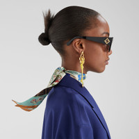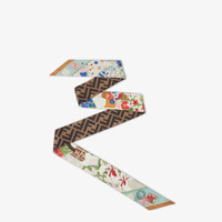 Two-sided wrappy. Can be worn around the neck, knotted at the wrist or used to accessorize a bag with a touch of color. Made of silk. One side features a green-toned Fendi Flowers motif, inspired by Rome’s flower market and designed to capture the city’s atmosphere in a pattern that echoes the collection’s theme. The other side is printed with the iconic brown FF motif. Made in Italy Composition: 100% silk Product Code: FXT011B01UF1WO3
