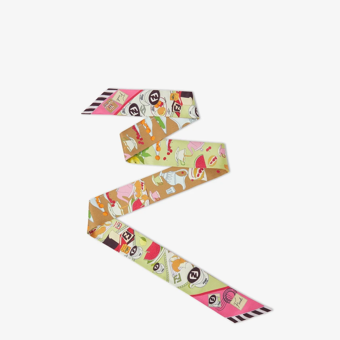 Two-sided wrappy. Can be worn around the neck, knotted at the wrist or used to accessorize a bag with a touch of color. Made of multicolor silk. The Fendi Food motif, printed on both sides, playfully celebrates the classic Roman breakfast in a pop-art style. With fresh fruit, pastries and coffee cups, the design turns everyday imagery into a bold graphic with a contemporary, ironic flair. Made in Italy Composition: 100% silk Product Code: FXT011B026F1WSD