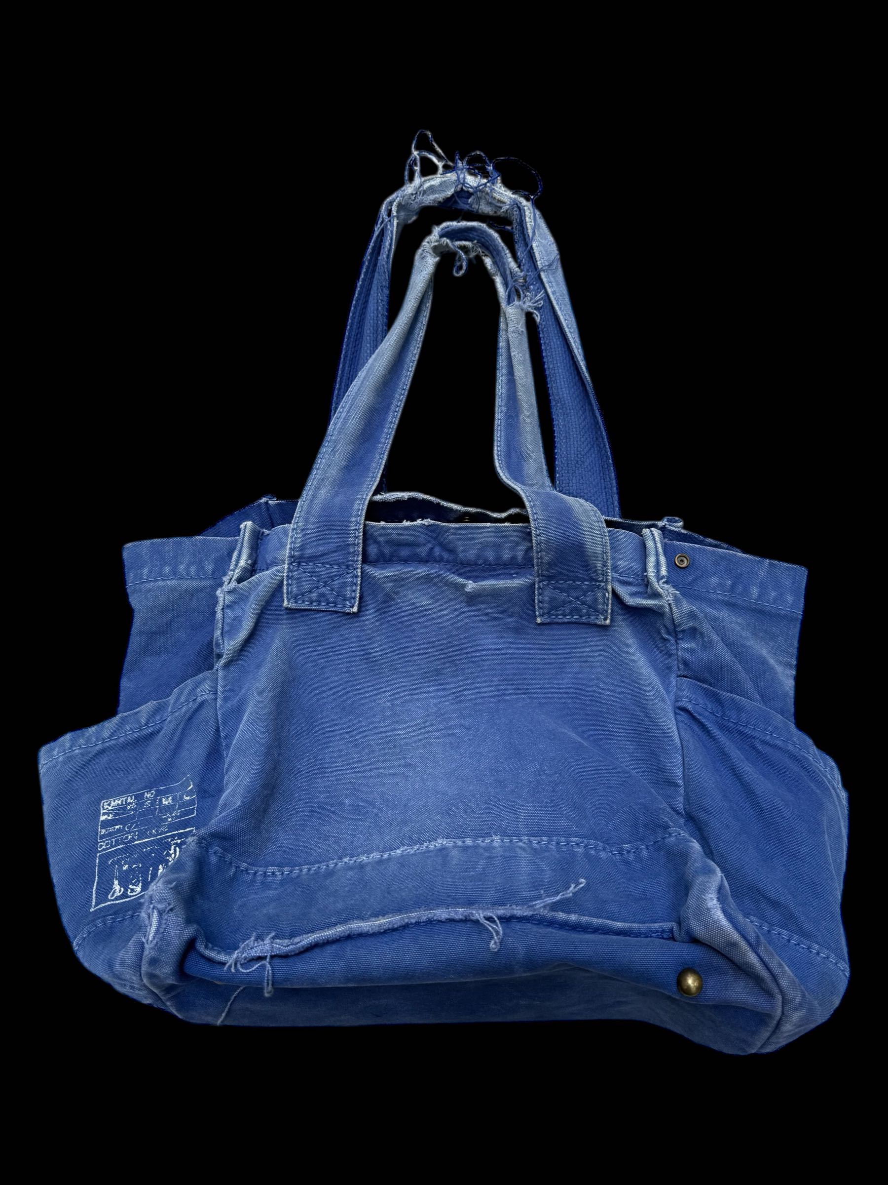 Original Kapital tote bag in heavy-duty blue canvas with natural fading and frayed strap details. Spacious design with multiple pockets and snap button closures. Interior features Kapital label with zip pocket. Perfect everyday carry with authentic worn-in Kapital character. Brand: Kapital (Japan) Material: Heavy cotton canvas Color: Faded indigo blue Features: Large open compartment Side and front exterior pockets Inner zip pocket with Kapital tag Snap button closures Condition: Distressed used, strap fraying and visible wear (see photos) Size: Approx. 15” (H) x 22” (W) x 11.5” (D)
