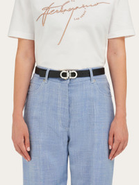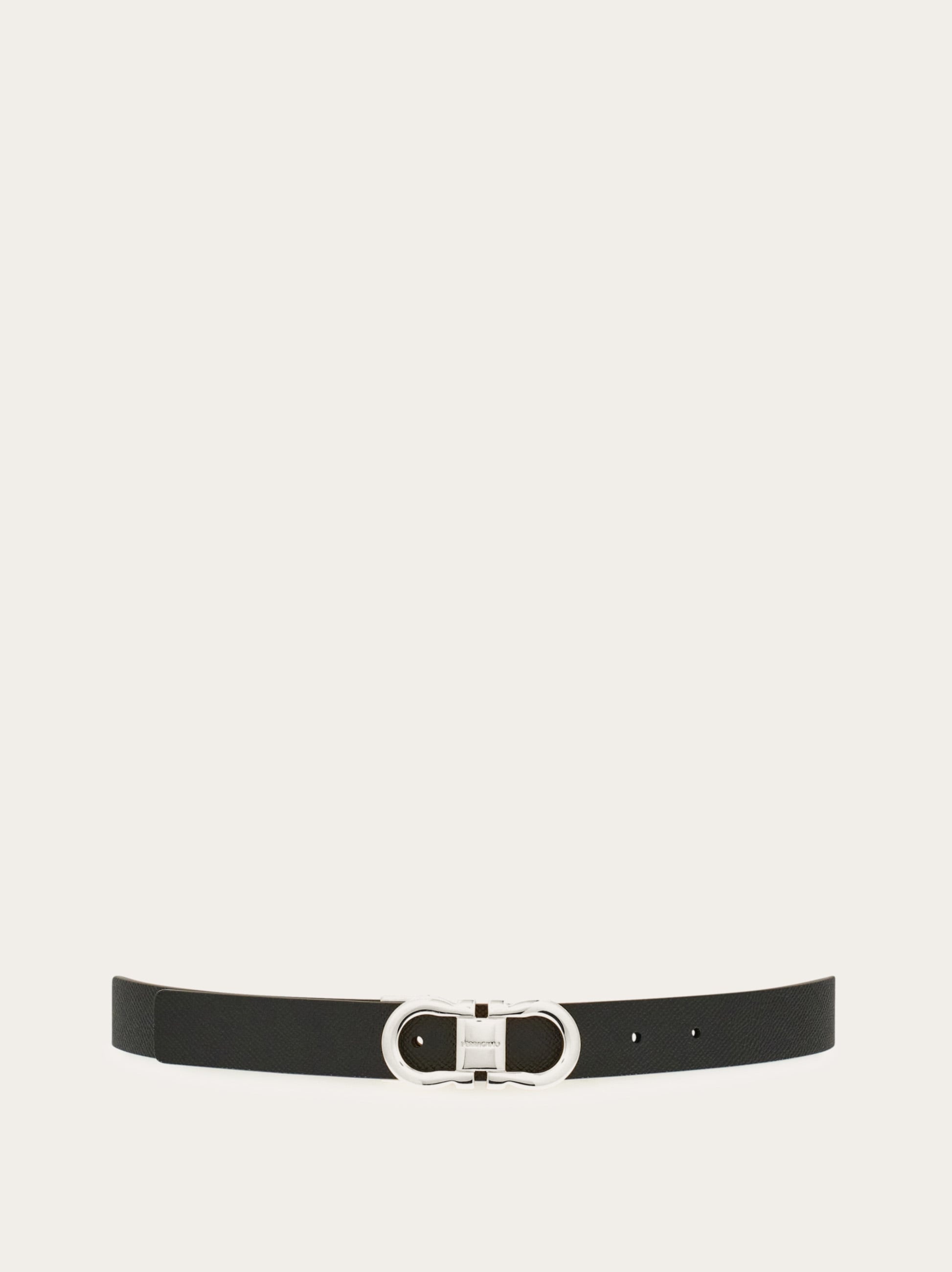 Subtle for an extra touch of femininity, reversible for use that transcends everyday looks. Hammered calfskin belt with reversible construction, adjustable length and two-tone design. The iconic Gancini buckle in a palladium finish is offered with a squared profile for a graphic and more current note. The adjustable length allows for a more personalized fit and style. We invite you to check our size guide for more information. - height 0.9 IN - Composition: hammered calfskin - Made in ITALY - Product code: 230294 781810