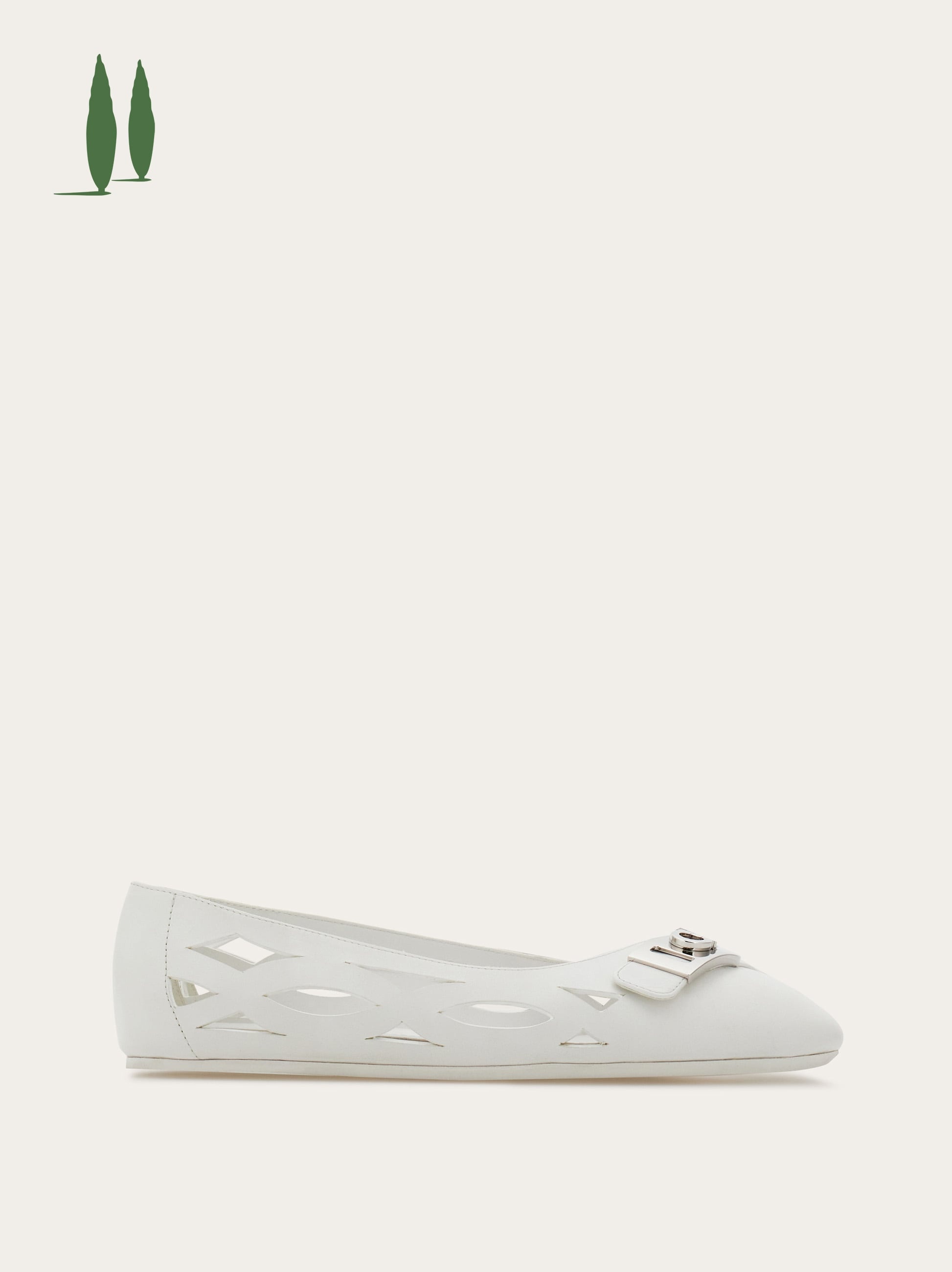 A feminine ballerina with a sustainable soul, featuring a rounded toe and perforated calfskin upper. The toe strap is adorned with the Hug buckle, crafted from 100% recyclable steel. Made from Italian vegetable-tanned leather sourced through a short supply chain, the upper reflects a commitment to responsible craftsmanship. The insole combines recycled fibers, cellulose from responsibly managed forests, and an innovative natural fiber infused with resins. Finished with a bio-based rubber sole for an eco-conscious touch. - Composition: calfskin - Made in ITALY - Product code: 01K735 787130