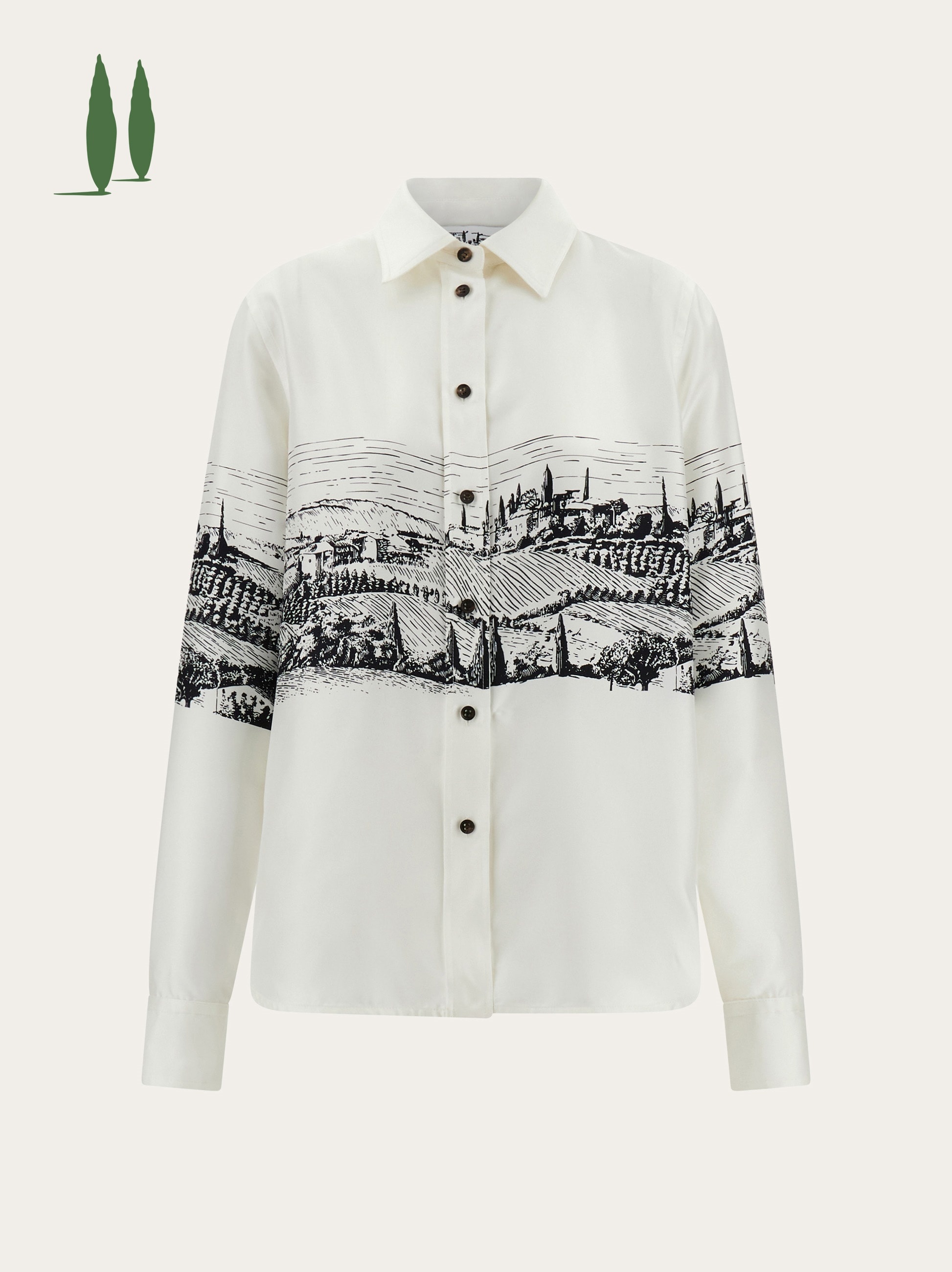 An exclusive piece from the Back to Earth collection, this organic silk shirt celebrates the beauty of nature. The lithograph printed design is set on a minimal silhouette whose clean lines leave room for its message: a return to nature. This garment is made entirely of organic silk. The print is made using Bio Black TXTM, a bio based high performing water-based pigment. - Composition: 100% organic silk - Model measurements: Height 5' 11"/180 cm; Bust 33"/84 cm; Waist 23½"/60 cm; Hips 34½"/88 cm - Model wearing: 38/XS - Made in ITALY - Product code: 13H469 786945