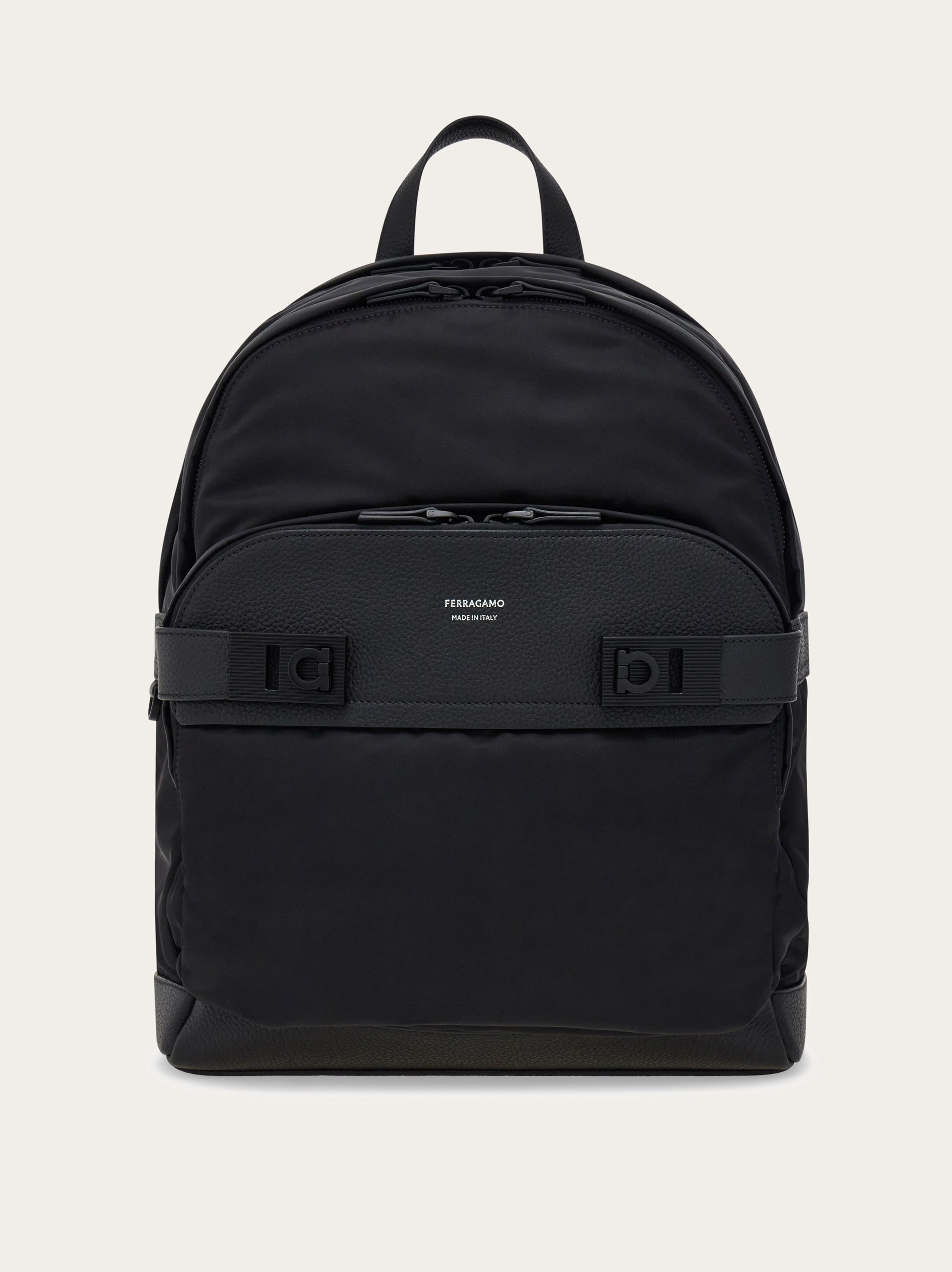 Fashion meets function in this new Ferragamo backpack. The rounded silhouette, with hammered calfskin accents, features a fully organized interior complete with padded pocket for digital devices. A large front pocket, fastened with Gancio buckles, a hand luggage strap and breathable back padding complete the design. - height 15.7 IN length 12.2 IN width 7.8 IN - Composition: fabric and hammered calfskin - Made in ITALY - Product code: 241782 786266