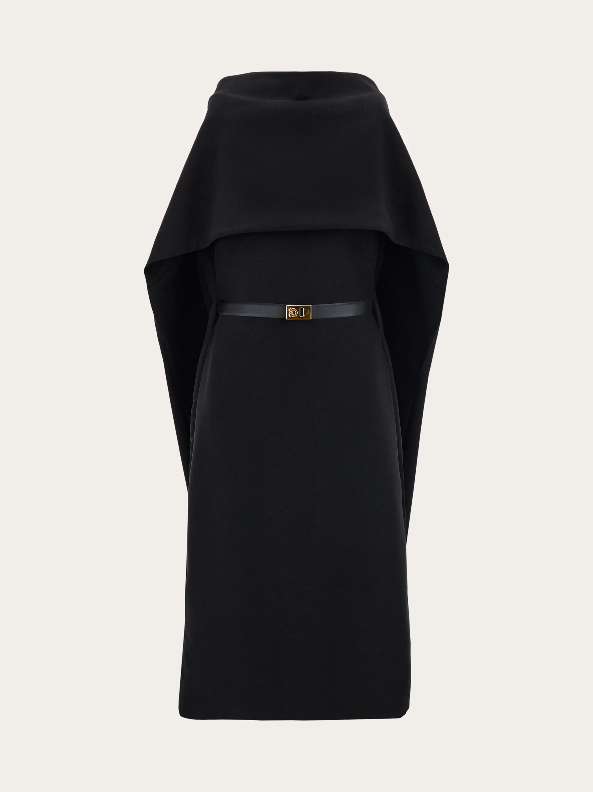A sophisticated blend of wool and viscose faille is used to bring this belted dress to life. The strong silhouette features an integrated shawl across the front which melts into a deep V-cut at the back. The edges of the cape softly billow over the midi length dress which is cinched at the waist and detailed with a golden Hug buckle. - Composition: 73% viscose, 27% pure virgin wool - Made in ITALY - Product code: 13H524 788143
