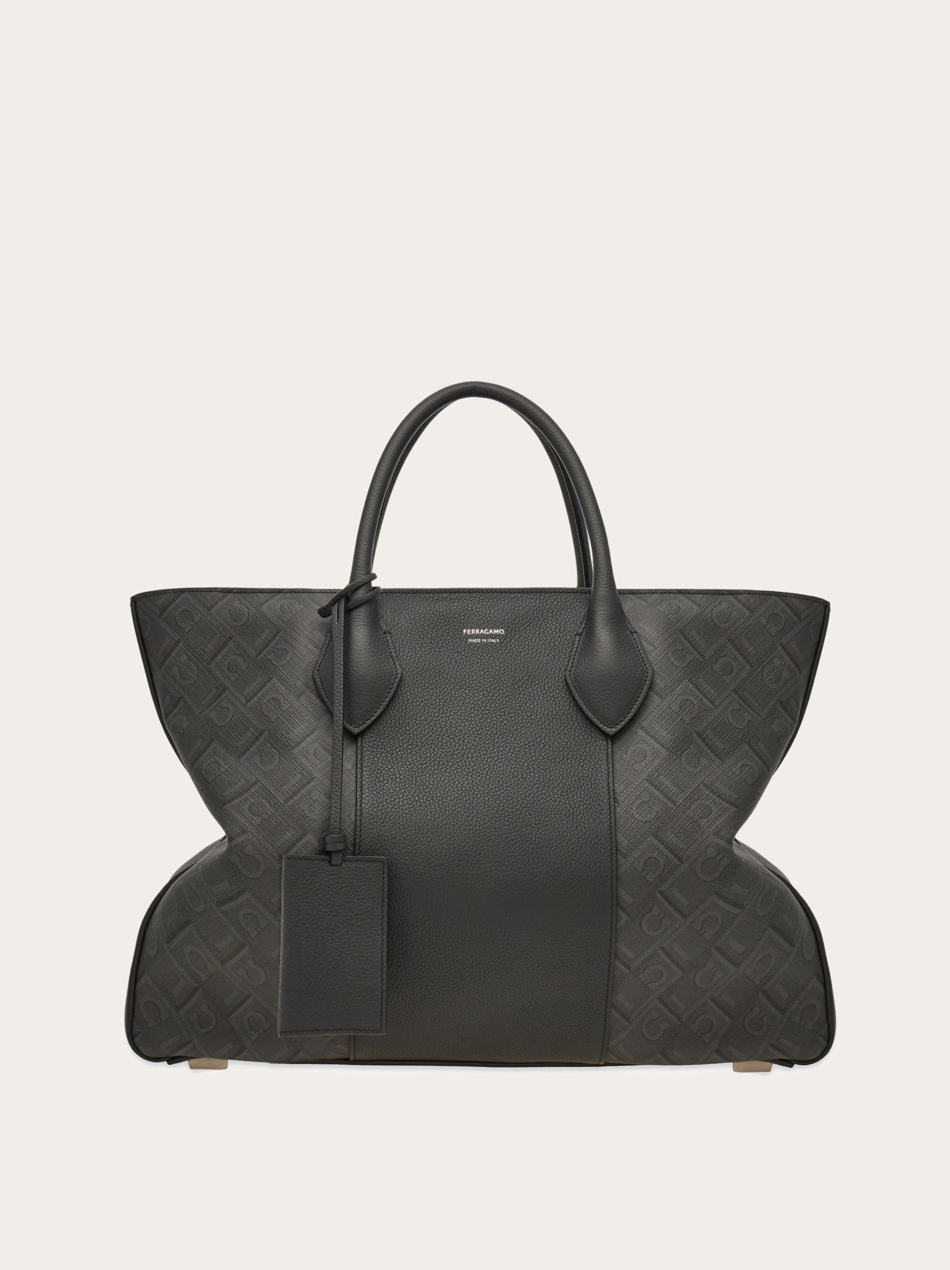 Spacious and versatile, this large tote bag features deconstructed lines with folded sides that create a distinctive star shape. Crafted from technical canvas with a Ferragamo Monogram print, it's enriched with a central insert in soft tumbled leather. The long leather handles slip effortlessly over the shoulder, making it easy to go hands-free. Perfectly proportioned to function as a weekender bag, the style is finished with a lined interior, a zip pocket, and two keychain and address tag charms. Removable and adjustable jacquard strap. - height 12.9 IN length 17.3 IN width 6.2 IN - Composition: polyurethane, calfskin - Large - Made in ITALY - Product code: 241410 779643