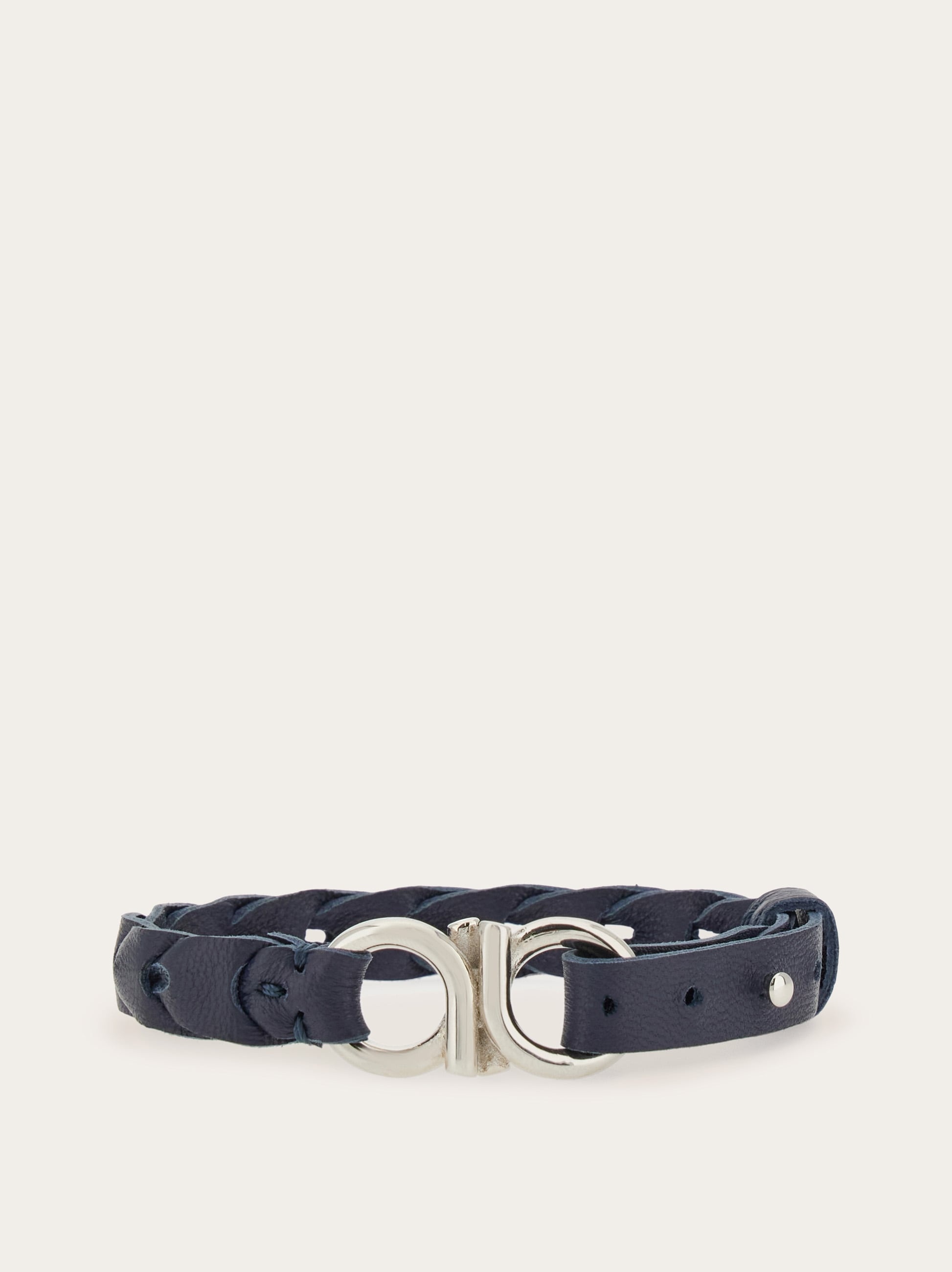 Embrace timeless elegance with this leather bracelet, adorned with a contemporary twist on the new Gancini ornament. This elegant bracelet features a distinctive braided strap, where the leather is meticulously woven into a sleek and tight pattern, adding texture and dimension. - Composition: calfskin and brass - Made in ITALY - Product code: 770378 780299