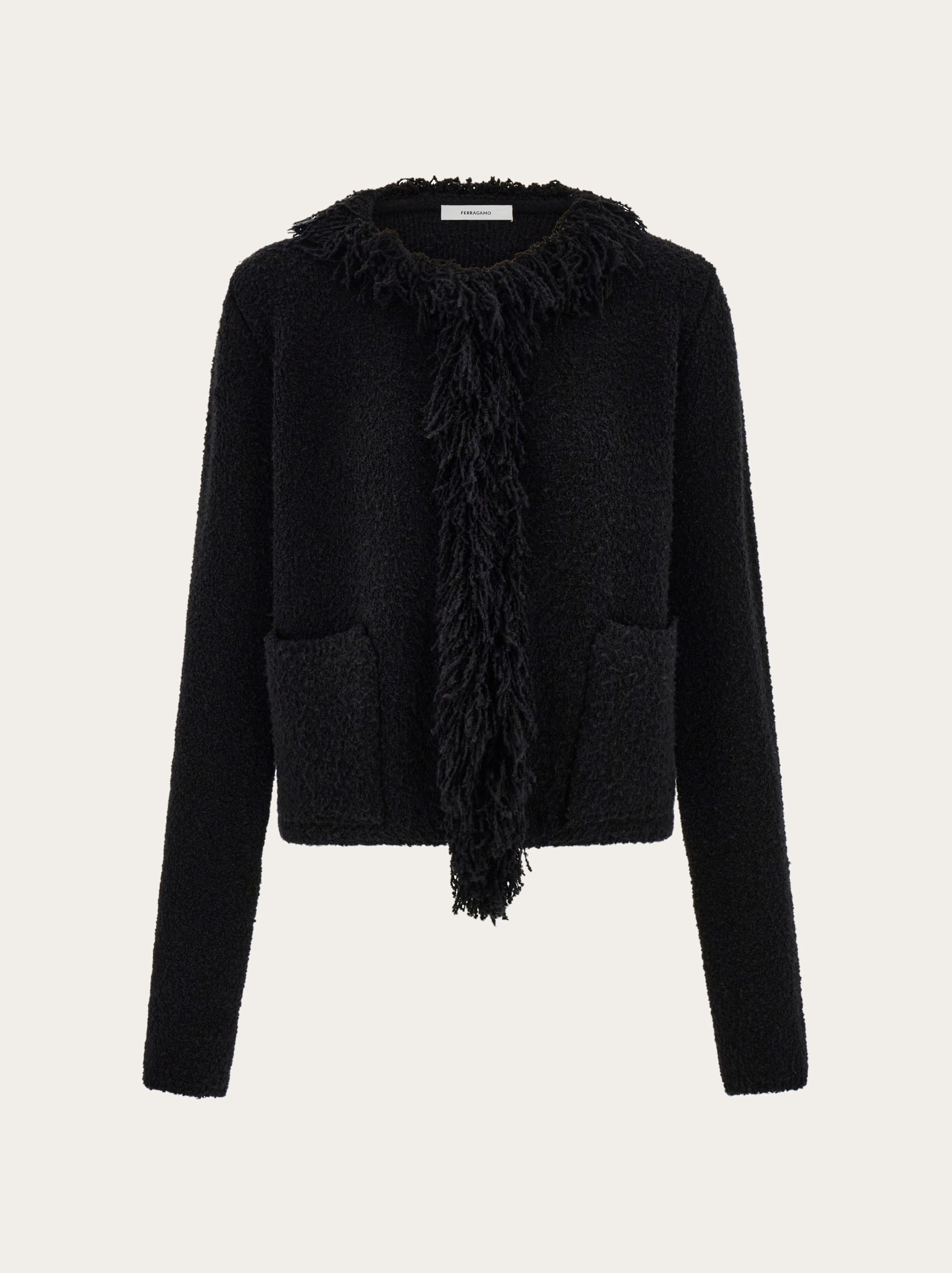 Warm and cozy with a hint of frivolity, this knitted cardigan flaunts a curated balance of sophistication and fun. Hook and eye clasps maintain the clean silhouette of the boucle yarn, detailed along the neckline by a voluminous fringe. - Composition: 89% silk, 8% viscose, 3% polyester - Model measurements: Height 5' 9"/175 cm; Bust 30"/76 cm; Waist 24"/61 cm; Hips 34½"/87 cm - Model wearing: 38/XS - Made in ITALY - Product code: 13H365 785510