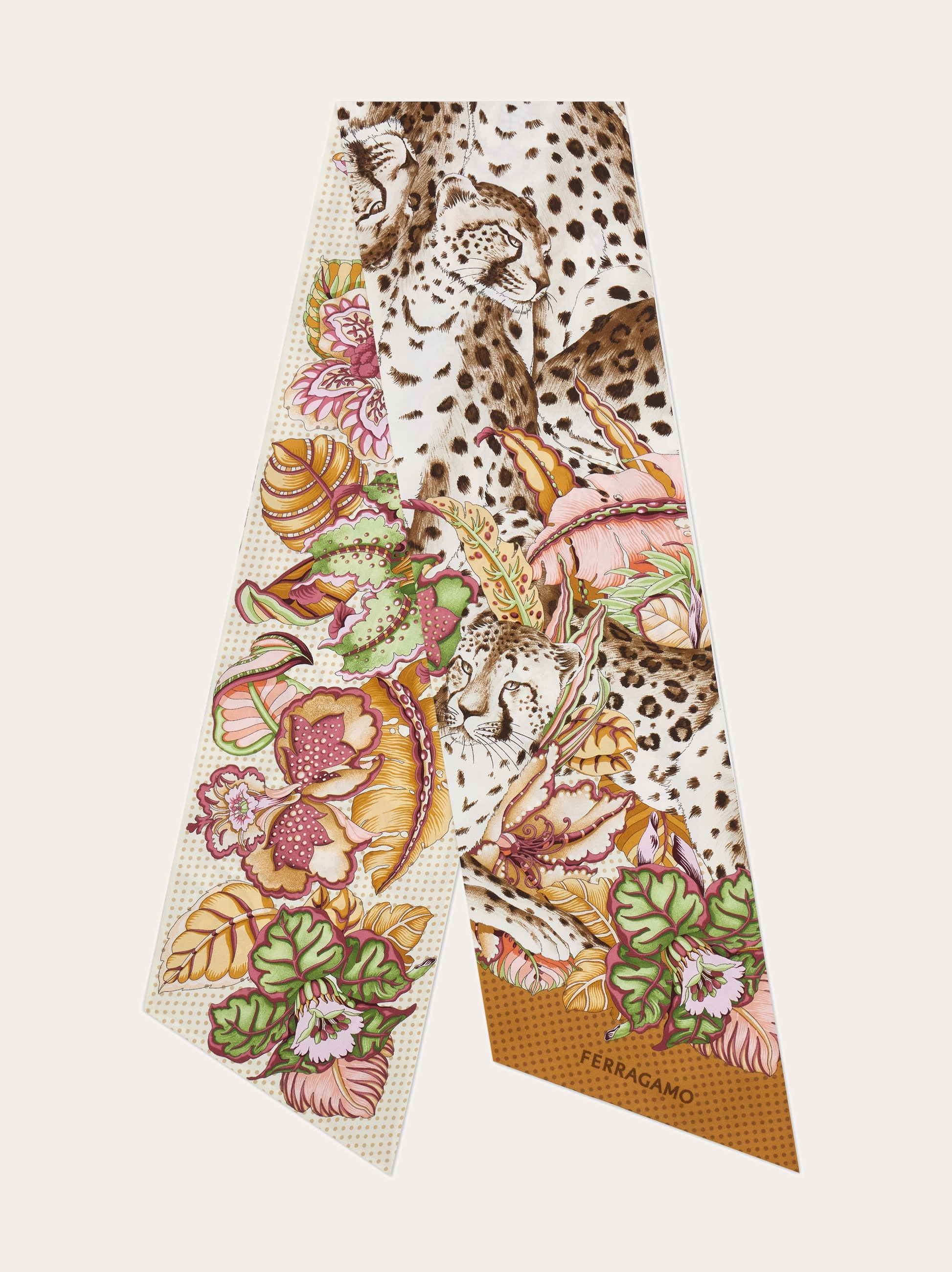 A most versatile accessory, the silk bandeau can be worn in your hair, around your neck, as a belt, or used to decorate your bag; the options are endless! This iteration is decorated with the Cheetah motif. - length 62.9 IN width 7.8 IN - Composition: 100% silk - Size 54 - Made in ITALY - Product code: 321245 789949