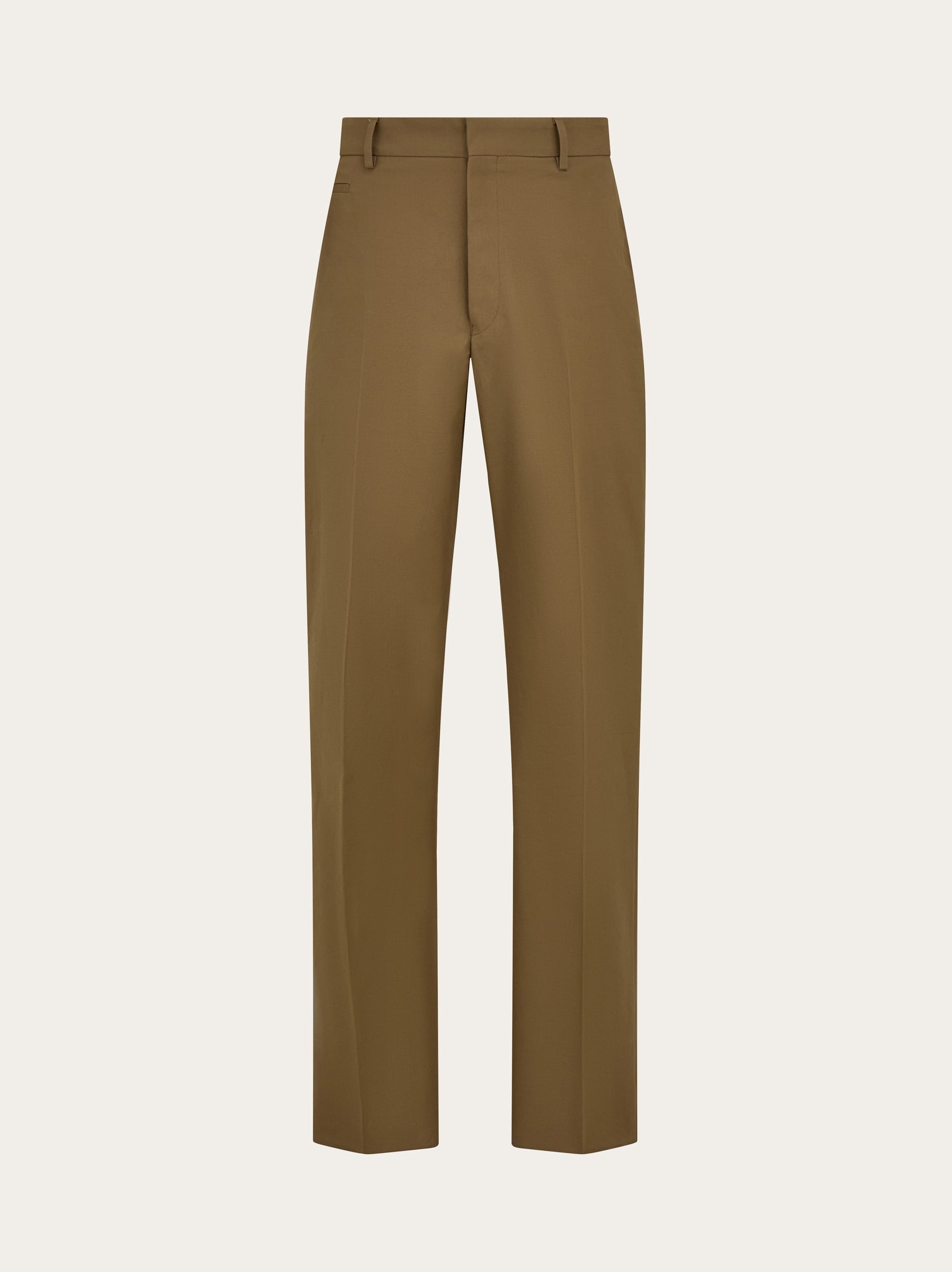 Designed with both comfort and style in mind, this cotton canvas trouser has a brushed, slightly velvety texture. The classic cut features side slit pockets with a tiny horizontal pocket, and welt pockets at the back. An ironed crease defines the leg, and a concealed hook fastens the waist. A custom metal tab is placed at the back. - Composition: 100% cotton - Made in ITALY - Product code: 144321 781811