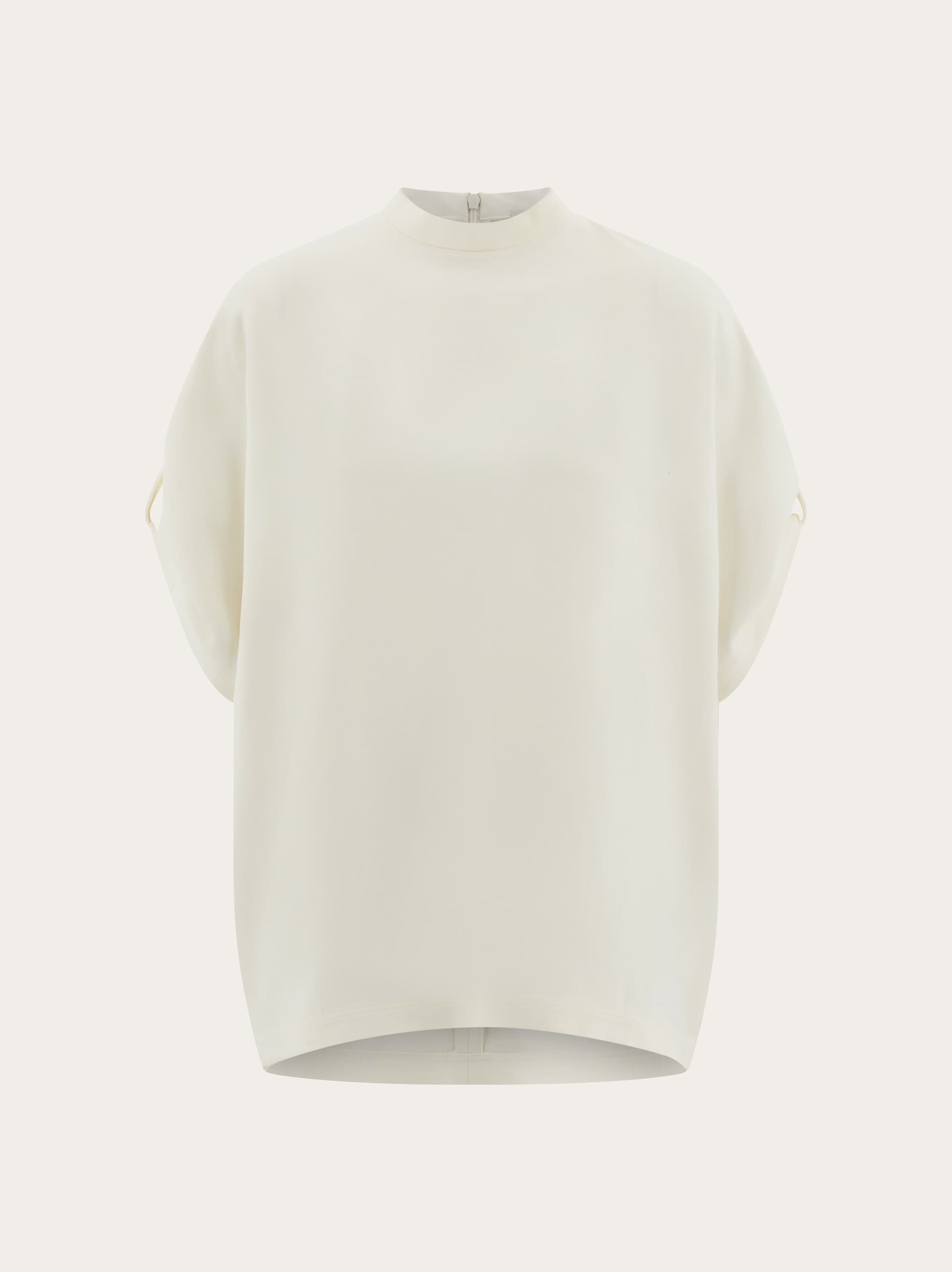A most versatile piece for both on and off the clock looks: cady stretch viscose top with a smooth, silky feel. The boxy fit confirms a current appeal, echoed by the turned up sleeve with contrasting buttons. A hidden zip at the back of the neck maintains the clean line. - Composition: 97% viscose, 3% elastane - Model measurements: Height 5' 10"/178 cm; Bust 31½ "/80 cm; Waist 23½"/60 cm; Hips 34 "/88 cm - Model wearing: 38 - Made in ITALY - Product code: 13G375 780945