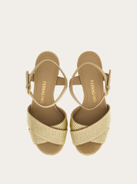 70s glamour comes to the fore in this platform sandal, entirely covered with microcrystals. Fusing traditional craftsmanship with a bold aesthetic, it's complete with the adjustable Gancini buckle adorning the ankle strap and the matching charm suspended from a delicate chain. - Composition: kid suede - Made in ITALY - Product code: 01K128 783097