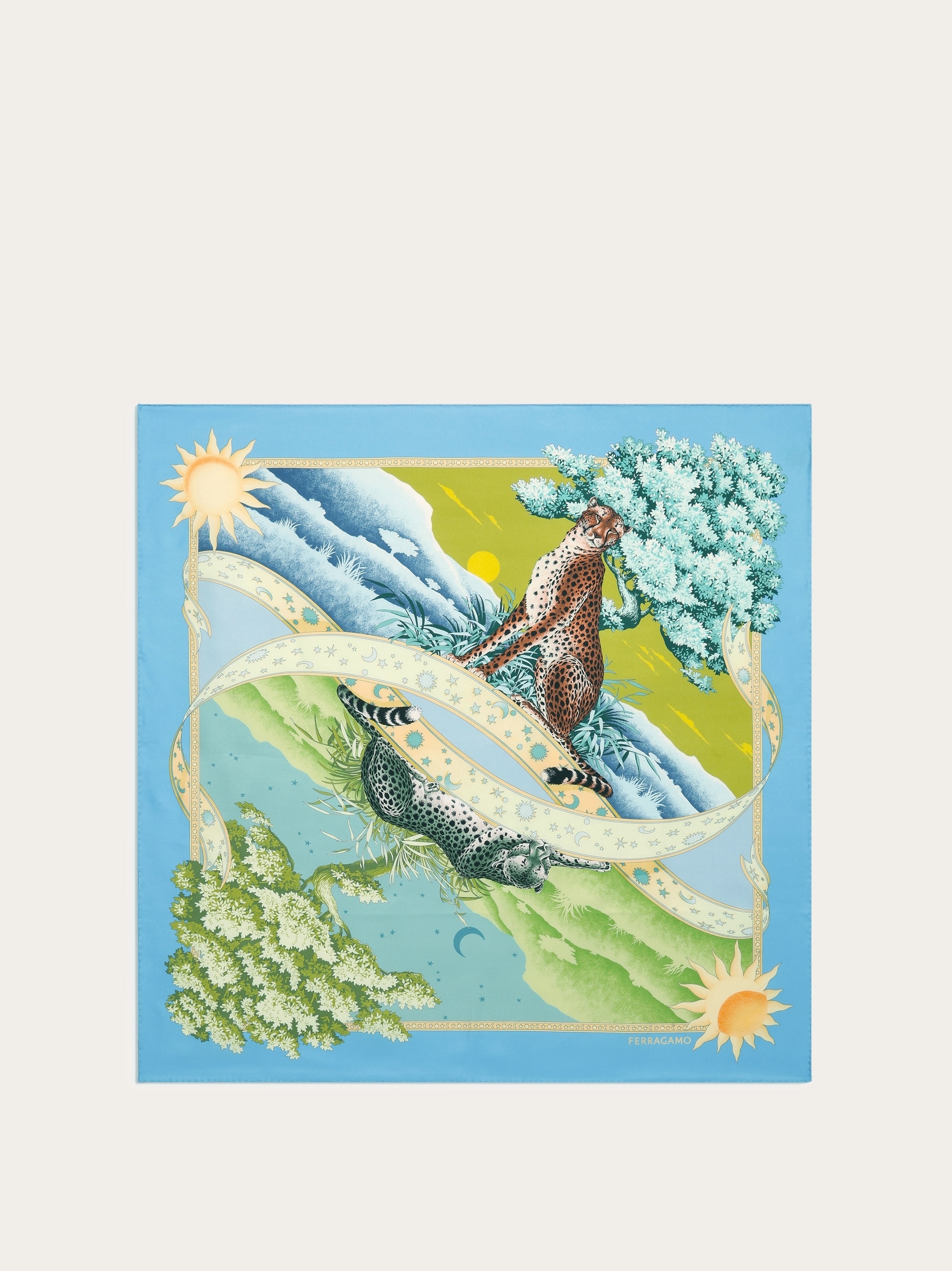 Inspired by an archival motif, the Day & Night print encompasses a variety of graphic themes and symbols dear to Ferragamo: the leopard, the Tenere Desert, the acacia tree. The contrasting diagonal coloring highlights the meticulous details and a striking contemporaneity. - length 35.4 IN width 35.4 IN - Composition: 100% silk - Made in ITALY - Product code: 310184 775496