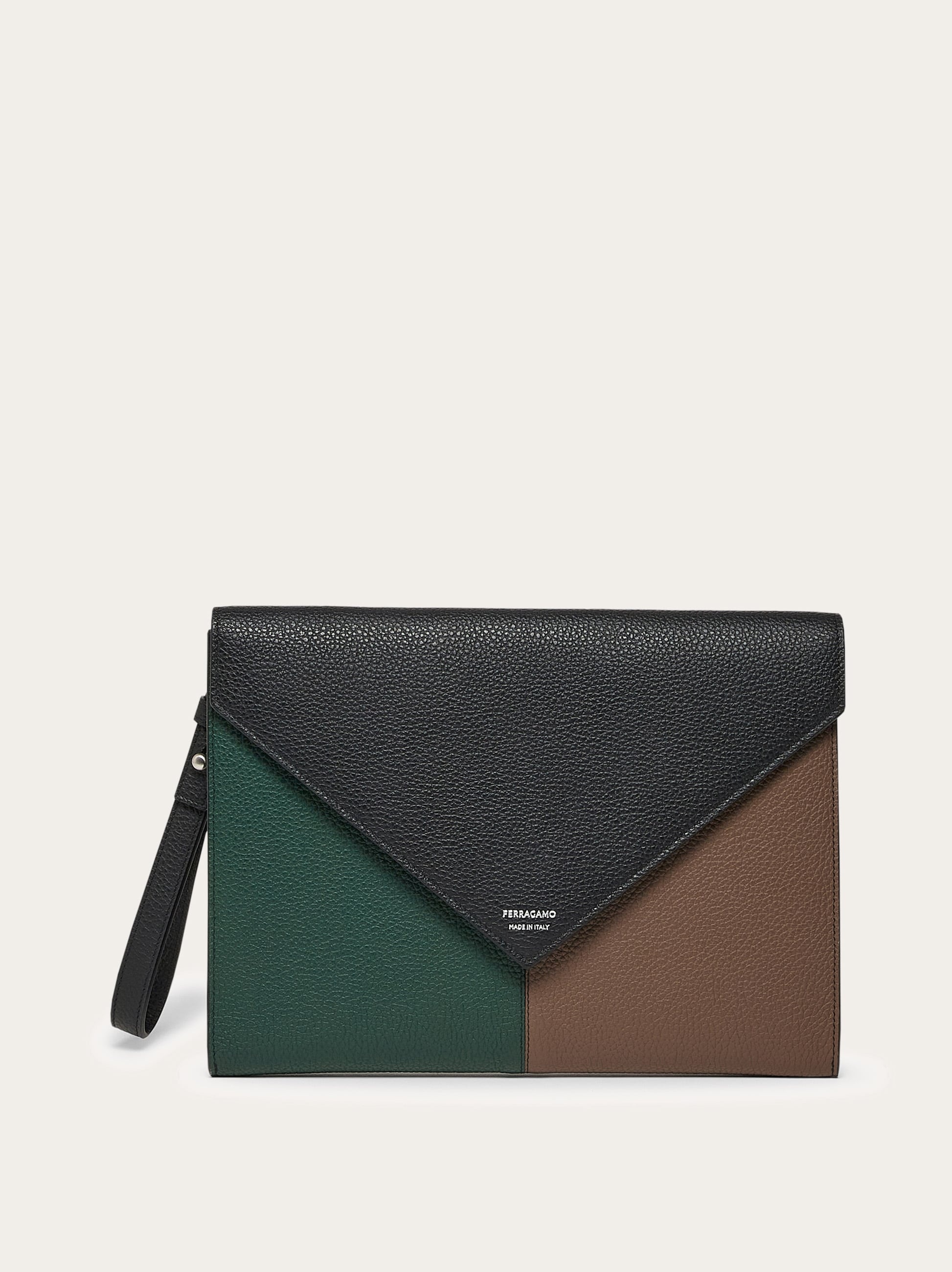 An innovative take on the document holder, featuring contrast-tone panels for a bold color-block effect. The sleek envelope design includes a flat back pocket and interior slots for cards and documents. Finished with a snap-button closure and a removable wrist strap on the back for added versatility. - height 7.4 IN length 9.8 IN width 0.7 IN - Composition: hammered calfskin - Made in ITALY - Product code: 661637 785580