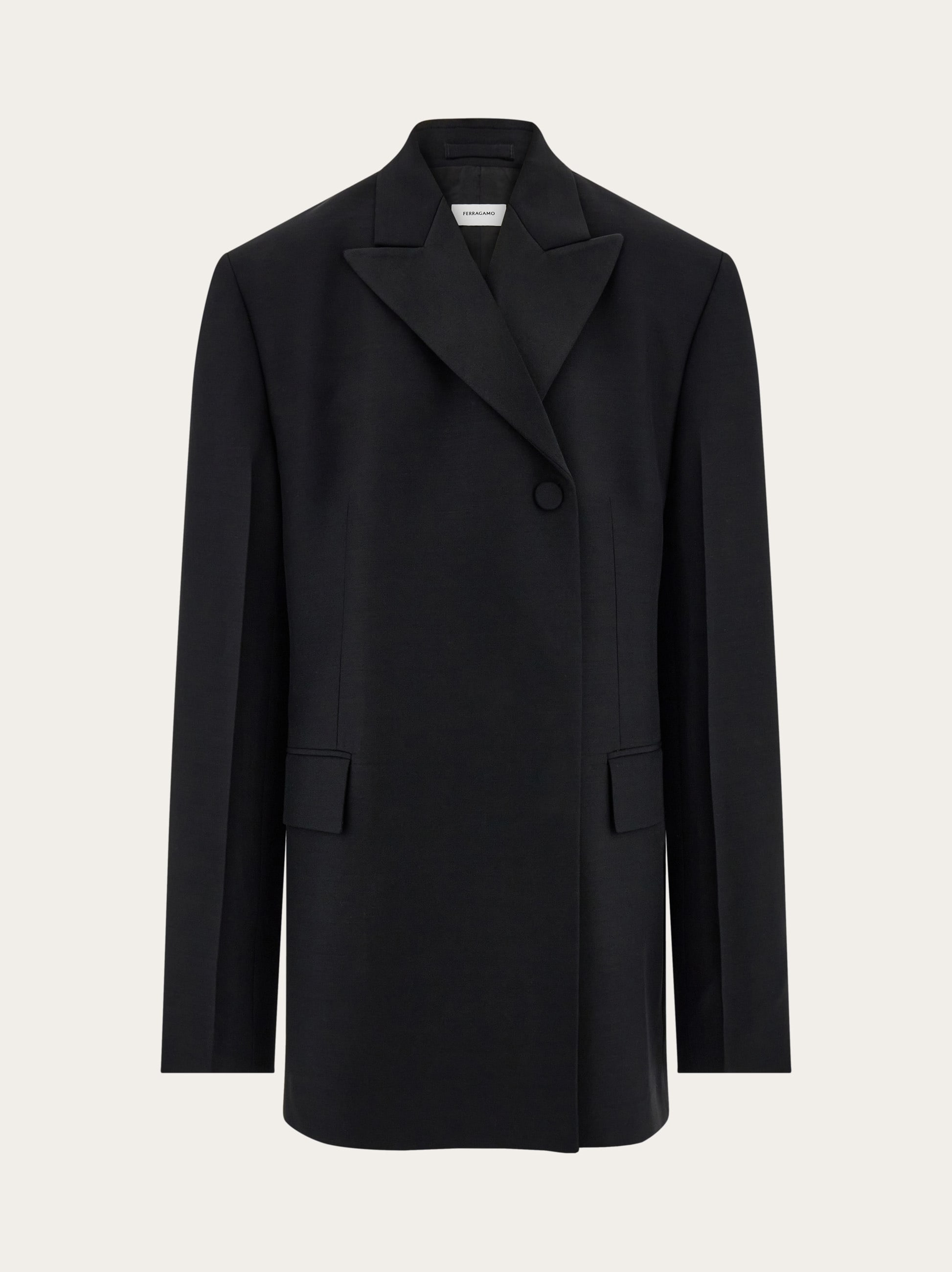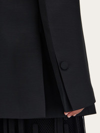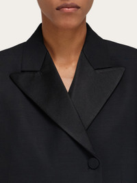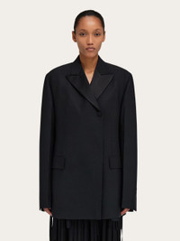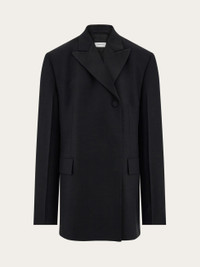 Ample volumes and a couture construction define the new interpretation of the tuxedo jacket by Maximilian Davis. The lapel neckline leads to a single visible button while the others remain hidden for a clean look. The oversized shoulders with pressed pleat and satin inserts on the lapel confirm a contemporary sophistication. - Composition: 73% viscose, 27% pure virgin wool - Made in ITALY - Product code: 13H685 788044