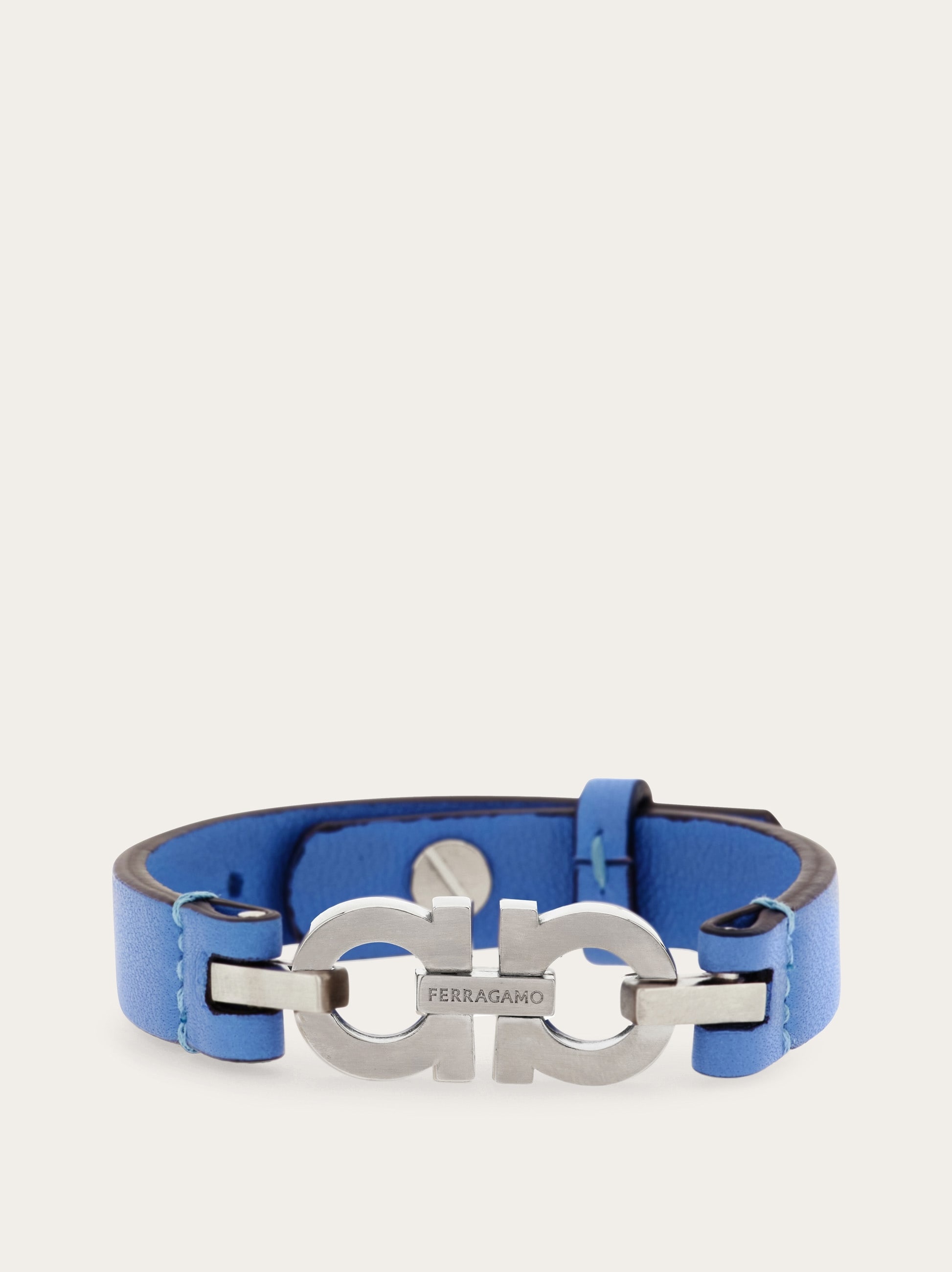 The calfskin strap of this new Ferragamo bracelet fastens like a belt strap. The central element is two Gancini buckles held together by a rectangular link with embossed logo. - Composition: 60% calfskin, 40% brass - Made in ITALY - Product code: 770384 785727
