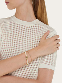 A double-strand bracelet featuring pearls, Gancini silhouettes, a metal chain, and sparkling crystals. The C-shaped clasp adds a functional touch to the design. - Composition: brass and crystals - Made in ITALY - Product code: 760934 790681
