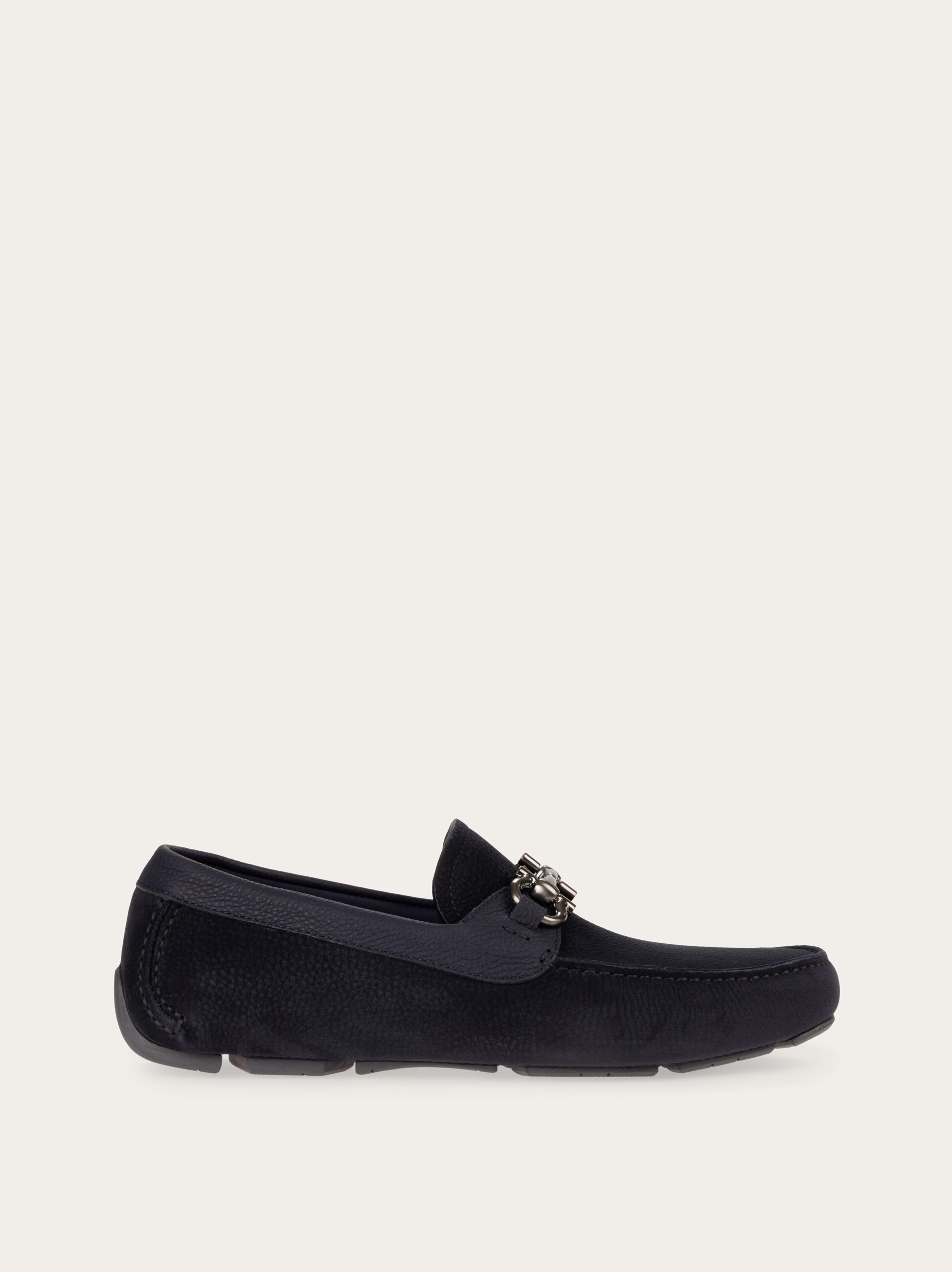 Casual yet refined, this driver loafer is crafted from naturally textured calf leather and velvety nubuck, adding depth and dimension to the sleek, rounded shape. It's finished with apron-toe seams, a lacquered Gancini buckle across the instep, and a rubber sole with custom tread. The tubular construction method, which involves meticulous hand-stitching and assembly, ensures a flexible and lightweight silhouette. - Composition: nubuck and calfskin - Made in ITALY - Product code: 02C398 786963
