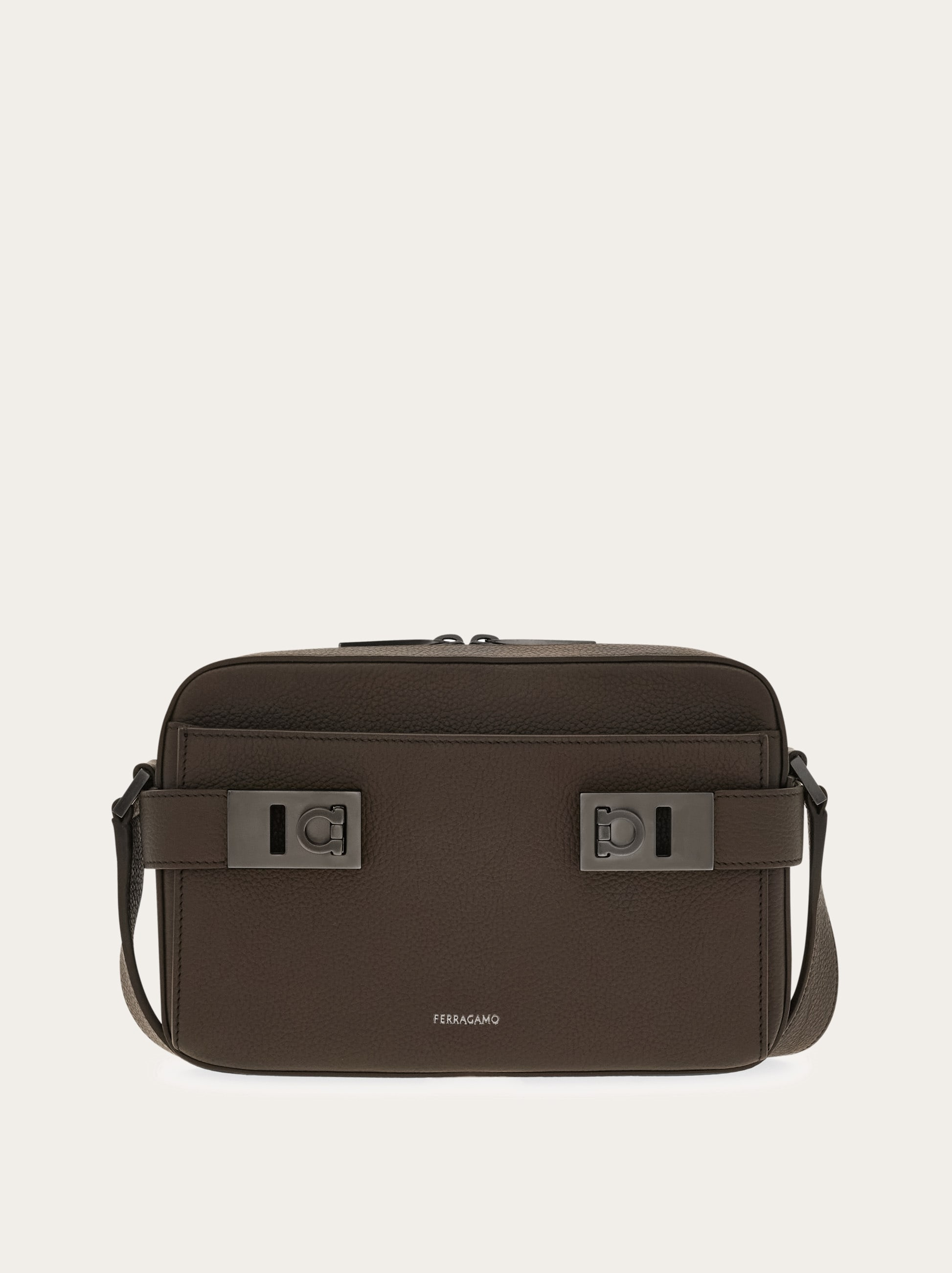 Compact cross body bag made of hammered calf leather with a soft, rich finish. The boxy shape features leather tabs on each side with Gancio buckles that open the front flat pocket. The top zip opens to a fabric lined interior with zip pocket. Adjustable leather strap. - height 6.2 IN length 9.4 IN width 2.3 IN - Composition: hammered calfskin - Made in ITALY - Product code: 241304 784775