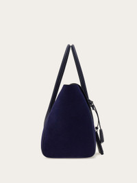 Large and spacious with high fashion appeal: the new Ferragamo tote finds its utmost expression in a deconstructed silhouette, with soft hammered calfskin on the exterior and a suede finish on the interior. The large flap with logo on the front can be slipped into the opening for two styling options. The accessory is complemented by an inner zipped pocket, a double keyring and badge charm, a stitched base, and custom metal studs to protect the base. - height 11.8 IN length 15.7 IN width 8.2 IN - Composition: calfskin suede and hammered leather - Large - Made in ITALY - Product code: 241462 785025