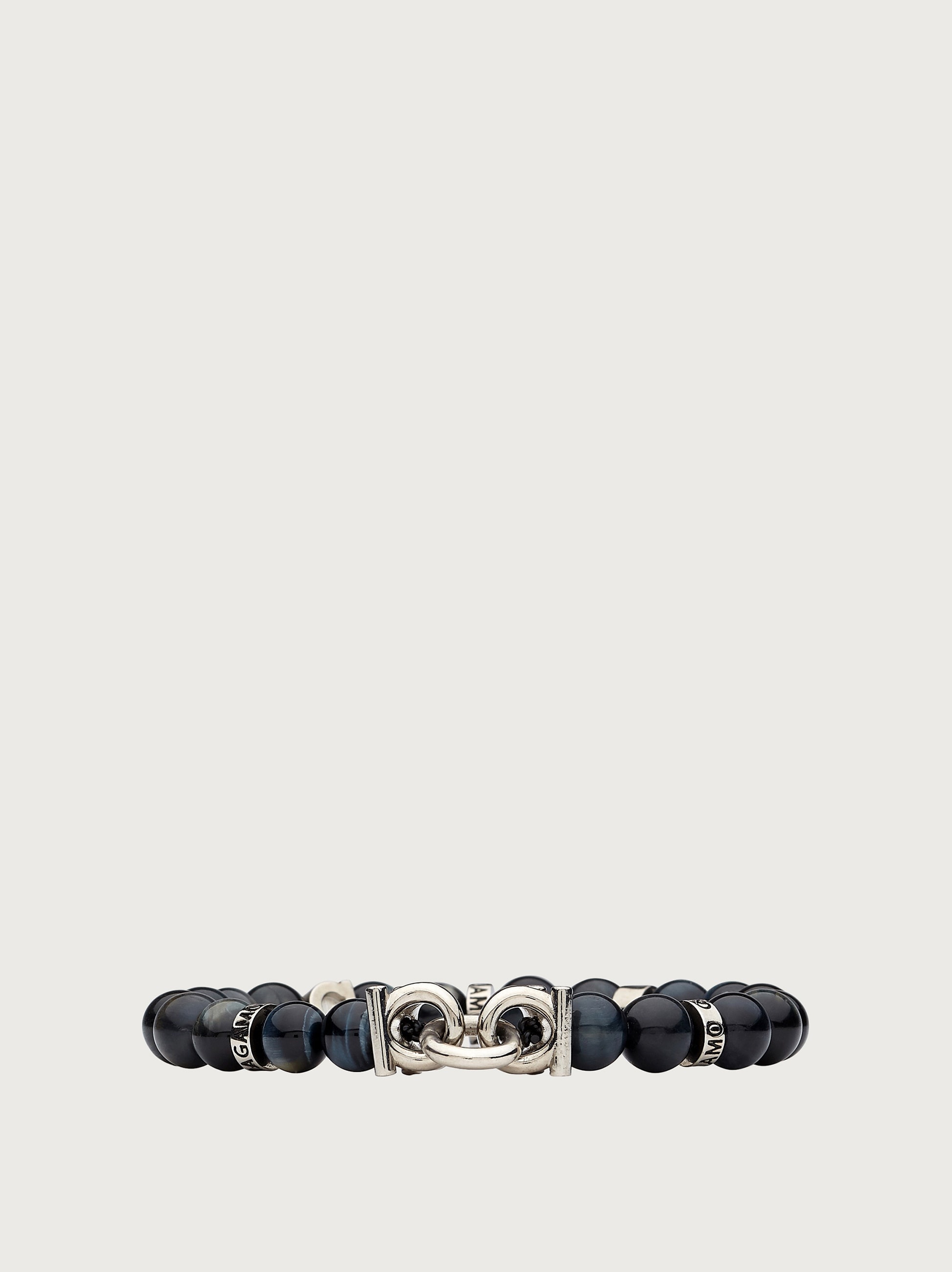 Ethno chic stretch bracelet made with lava stone pearls and metal Gancini details. Small inserts with Ferragamo lettering for a fresh and contemporary accessory. Length 19cm. - Composition: brass and semi precious stones - Size 19 - Made in ITALY - Product code: 770150 717502