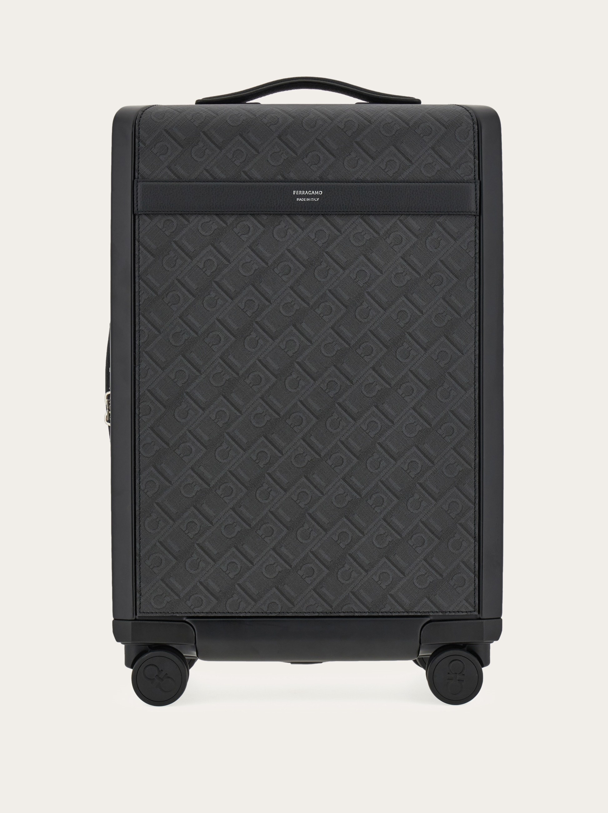 Semi-rigid cabin case with embossed Gancio pattern on the front. Four wheels ensure the perfect 360° spin. The ultra light structure features a combination lock and extendible handle. - height 21.6 IN length 14.9 IN width 8.2 IN - Composition: polyurethane, calfskin - Made in ITALY - Product code: 241165 780515