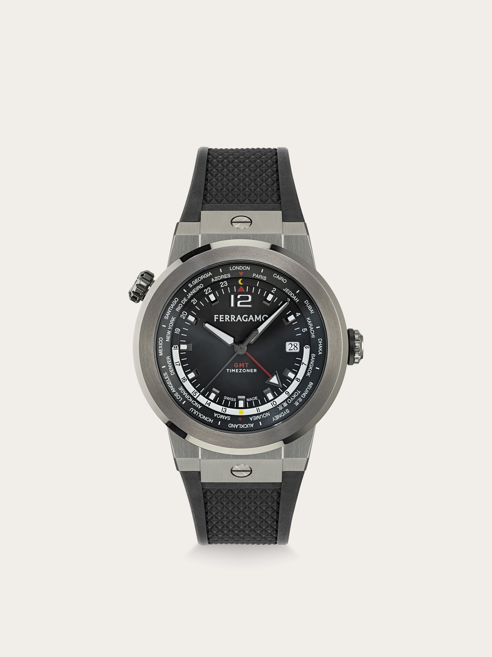 The iconic F-80 concept defines a dynamic and assertive watch whose sporty design is complemented by the advanced GMT Worldtime movement, which not only displays the local time but also includes an additional 24-hour hand for tracking a second time zone. Size: 43 mm Movement: RONDA 515.24H GMT - 4 hands quartz Case: IP gun - Crown with embossed “F” Dial: Black sunray - Red GMT hand Bracelet: Black recycled PU strap - Butterfly buckle with Ferragamo logo Glass: Sapphire crystal, anti-reflection, scratch-resistant WaterResistance: 100 meters 2+2 Year Warranty Outer box, packaging, warranty and instruction booklet - Composition: Stainless steel case and recycled PU strap - Made in SWISS - Product code: 611307 777420