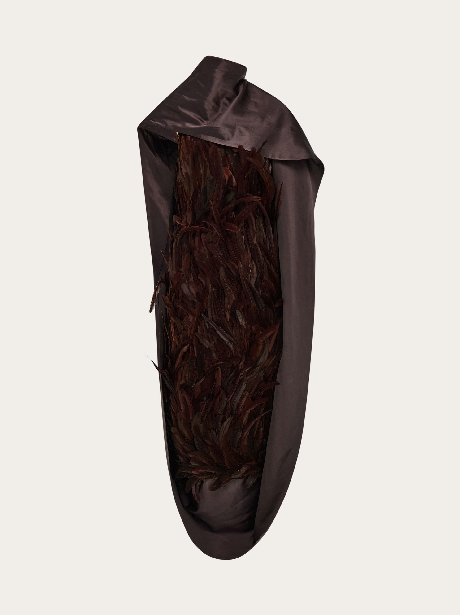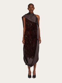 Embellished with grouse feathers, hand sewn onto the fabric base in Italy, this evening dress by Maximilian Davis is a work of wearable art. The wide sash wraps the neck and gracefully drapes along the left side framing the satin structure. The upward direction of the feathers speaks volumes about this season’s collection, whispering something the wearer will surely enjoy: expect the unexpected. - Composition: 100% viscose and feathers - Made in ITALY - Product code: 13H681 788358
