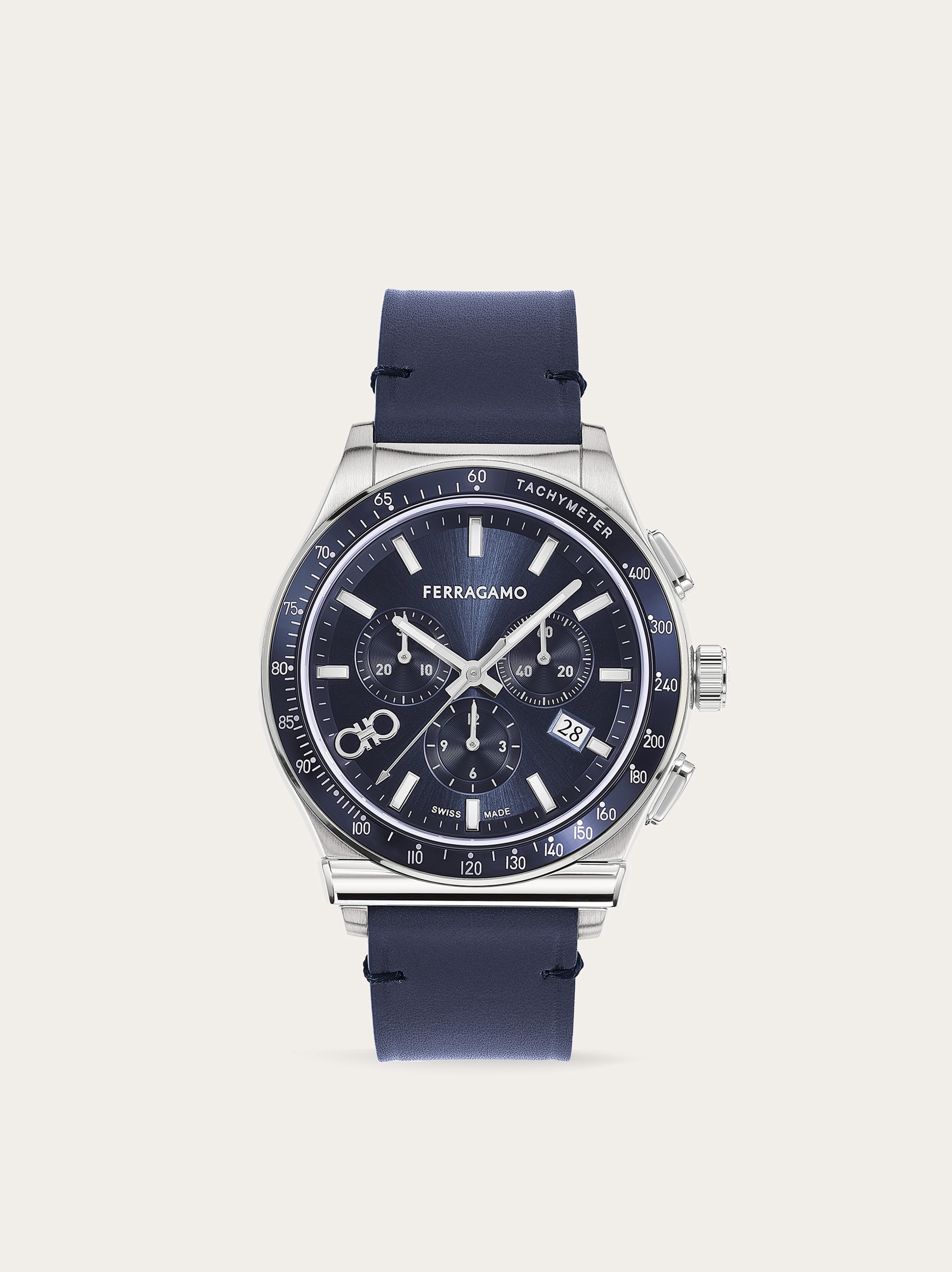 The new Ferragamo 1927 chrono recalls the brand’s heritage and the year of its foundation. Size: 42 mm Movement: RONDA 5030D - Chrono quartz Case: Stainless Steel blue top ring - Crown with embossed “F” Dial: Blue sunray with applied indexes and double Gancini at 8h Bracelet: Blue calf leather - Butterfly buckle with Ferragamo logo Glass: Sapphire crystal anti-reflection, scratch-resistant WaterResistance: 100 meters 2+2 Year Warranty Outer box, packaging, warranty and instruction booklet - Composition: Stainless steel case and calf strap - Made in SWISS - Product code: 611290 766024