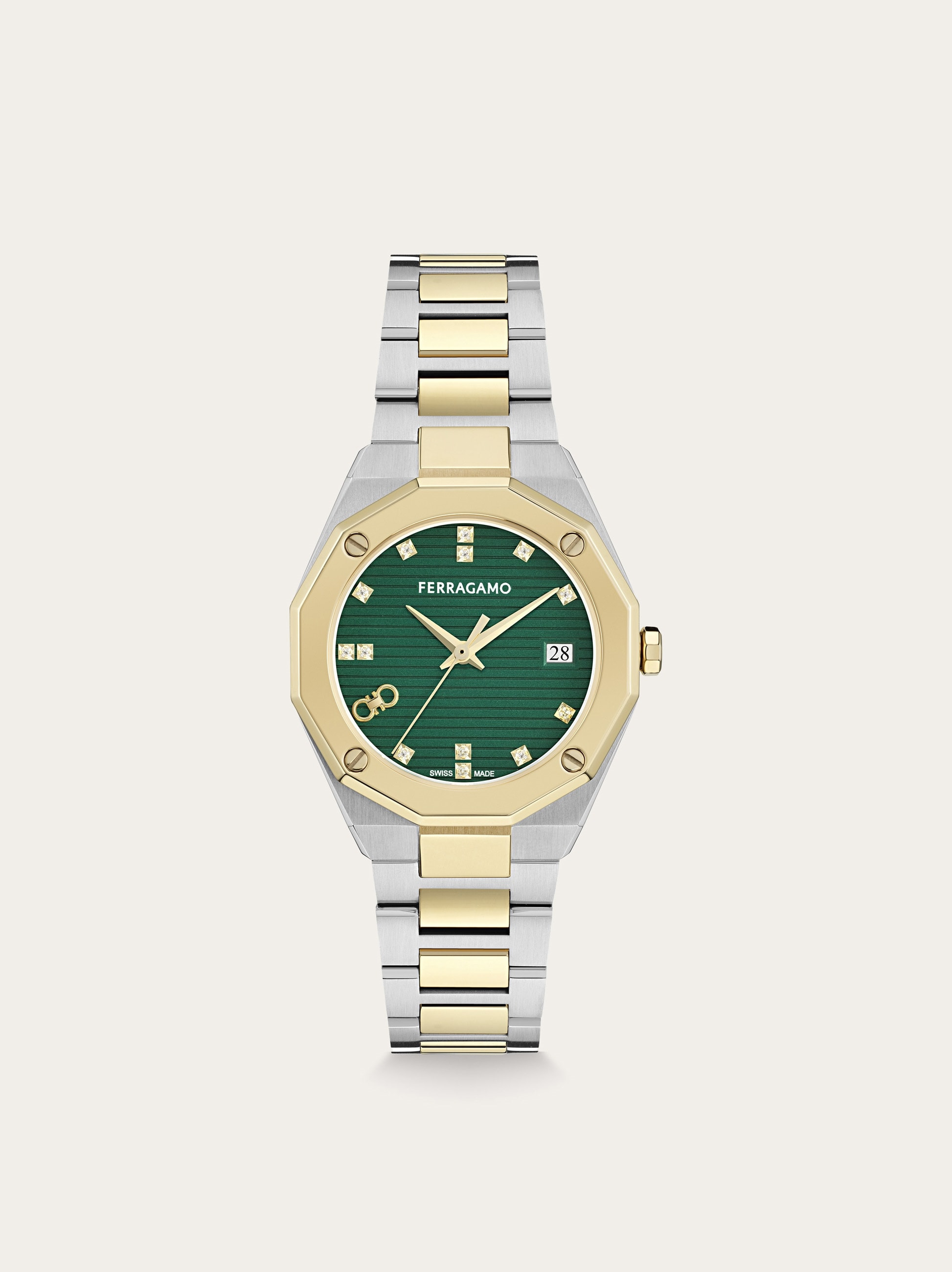 The Ferragamo Edge 3H captures refined minimalism with its clean guilloche dial, applied indexes, and a bold Double Gancini detail at 8 o’clock. Crafted in a 34 or 40 mm case, it blends modern geometry with Swiss precision. Size: 34 mm Movement: RONDA 705 - 3 hands quartz Case: Bicolor (SS&IPYG) - Crown with embossed “F” Dial: Green sunray guilloche dial, diamond indexes (13 0,68CT) Bracelet: Bicolor (SS&IPYG) bracelet - Butterfly buckle with Ferragamo logo Glass: Sapphire crystal, anti-reflection, scratch-resistant WaterResistance: 30meters 2+2 Year Warranty Outer box, packaging, warranty and instruction booklet - Composition: Stainless steel case and bracelet - Made in SWISS - Product code: 611342 789392