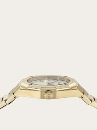 The Ferragamo Edge 3H captures refined minimalism with its clean guilloche dial, applied indexes, and a bold Double Gancini detail at 8 o’clock. Crafted in a 34 or 40 mm case, it blends modern geometry with Swiss precision. Size: 40 mm Movement: RONDA 705 - 3 hands quartz Case: IP Yellow gold - Crown with embossed “F” Dial: White-silver guilloche dial with DG index at 8h Bracelet: Yellow Gold bracelet - Butterfly buckle with Ferragamo logo Glass: Sapphire crystal, anti-reflection, scratch-resistant WaterResistance: 50meters 2+2 Year Warranty Outer box, packaging, warranty and instruction booklet - Composition: Stainless steel case and bracelet - Made in SWISS - Product code: 611343 789394