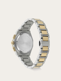 The Ferragamo Edge Chrono combines sporty sophistication with luxury. A mother-of-pearl guilloche dial or guilloche for gents, a bold 4-screw bezel in 36 or 42 mm, and precision chronograph functionality embody refined craftsmanship and contemporary elegance. Size: 42 mm Movement: VERTIME BV SM927 - Chrono Quartz Case: Bicolor (SS&IPYG) - Top ring with 4 screws Dial: Green guilloche with DG index at 8h Bracelet: Bicolor (SS&IPYG) bracelet - Butterfly buckle with Ferragamo logo Glass: Sapphire crystal, anti-reflection, scratch-resistant WaterResistance: 50meters 2+2 Year Warranty Outer box, packaging, warranty and instruction booklet - Composition: Stainless steel case and bracelet - Made in SWISS - Product code: 611340 789334