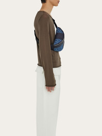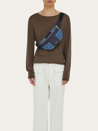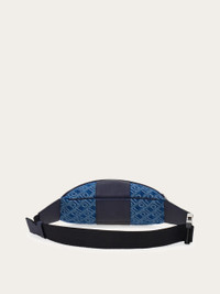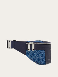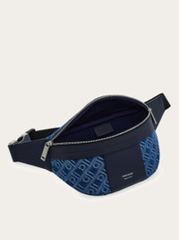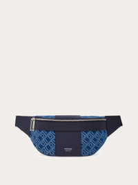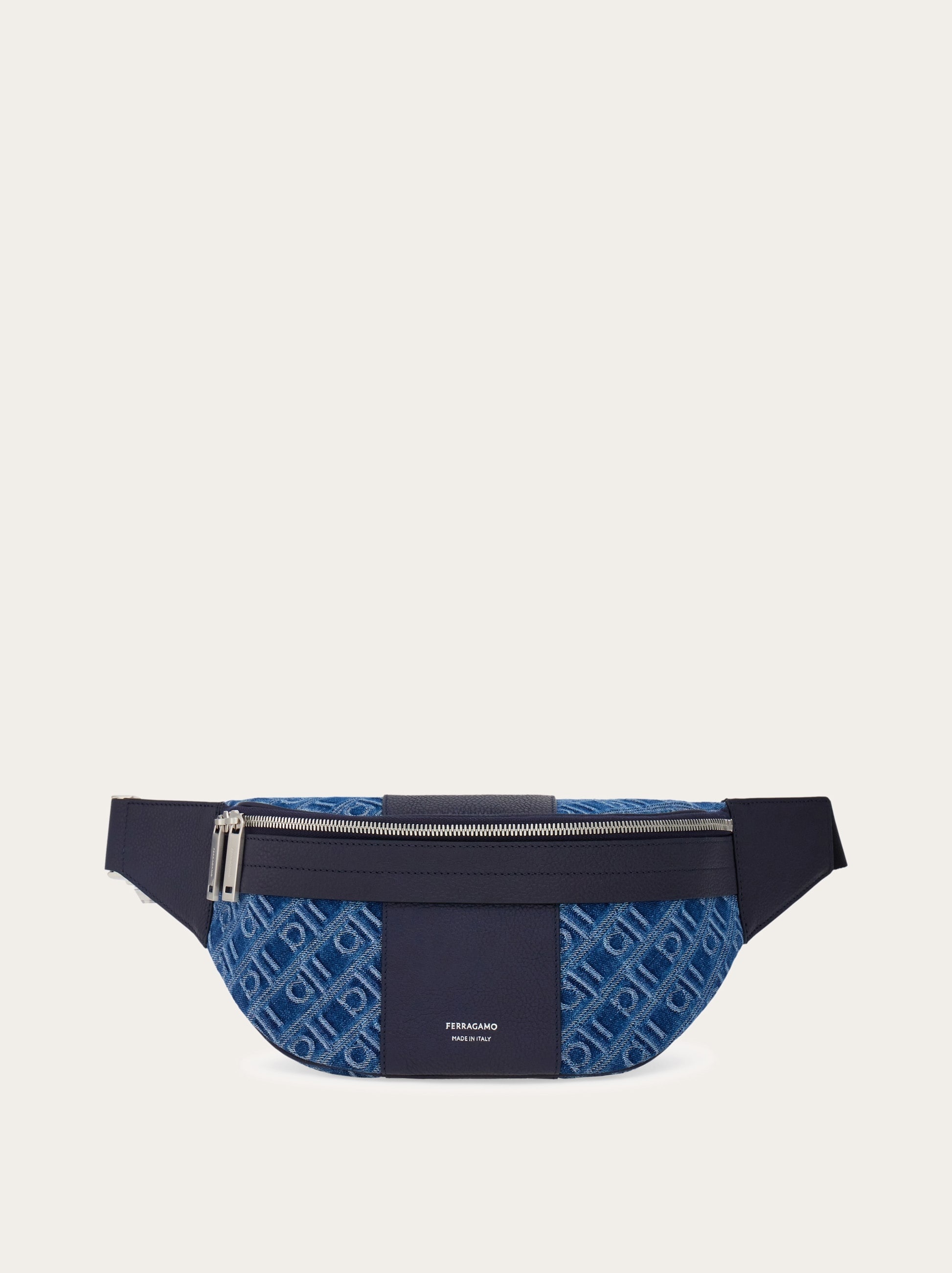 The timeless waist bag with a splash of logo mania. The Ferragamo Monogram in jacquard denim lights up this new hands-free accessory with hammered leather details. Practical details include a custom double slider zip and adjustable strap. - height 4.9 IN length 11.0 IN width 3.1 IN - Composition: fabric and hammered calfskin - Made in ITALY - Product code: 241793 784095