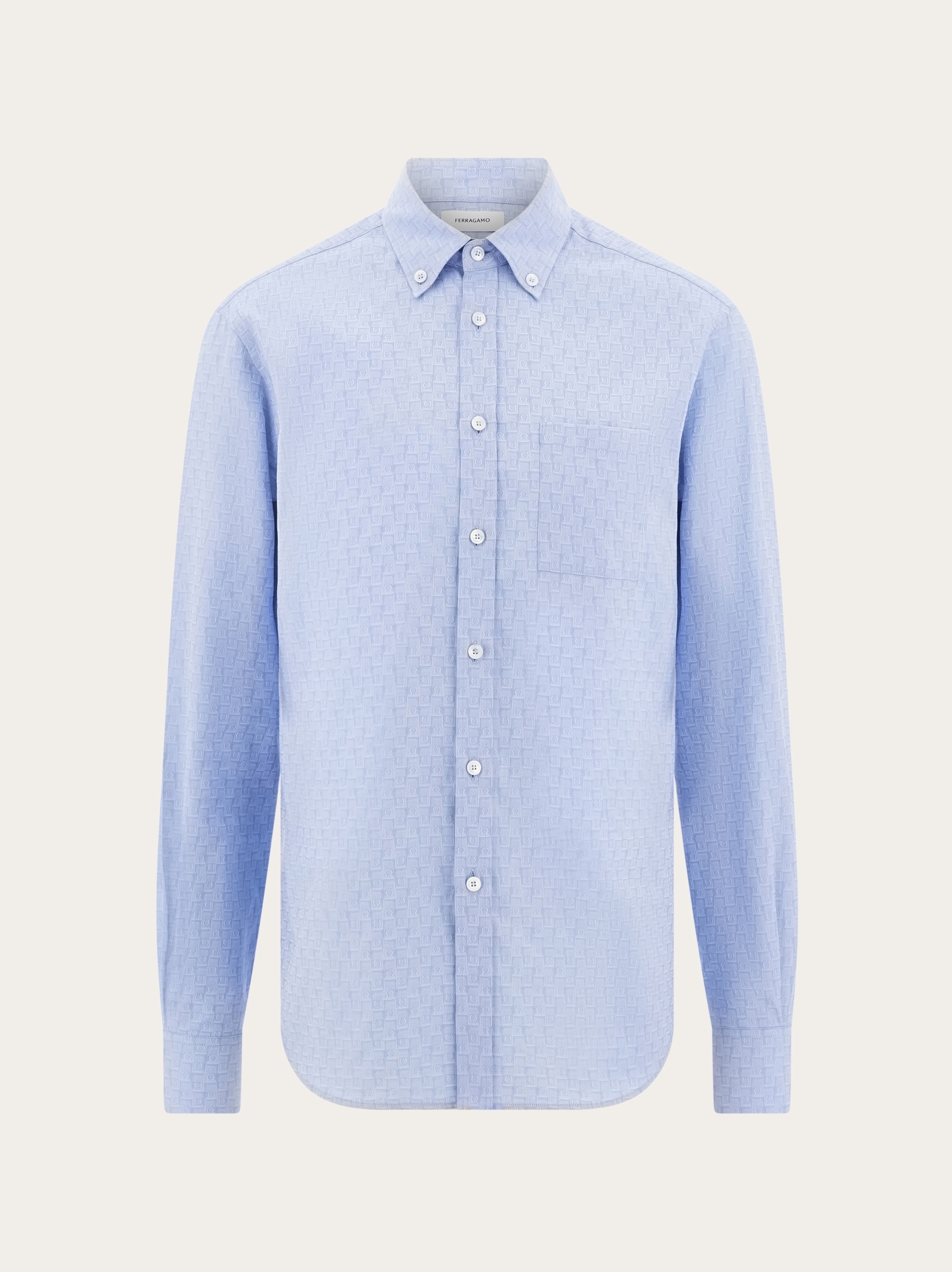 Regular fit shirt with a button-down collar, meticulously crafted from Oxford cotton with the Ferragamo monogram motif. Mother-of-pearl buttons add a refined touch to the model, completed with a squared chest pocket. - Composition: 100% cotton - Made in ITALY - Product code: 144352 780414