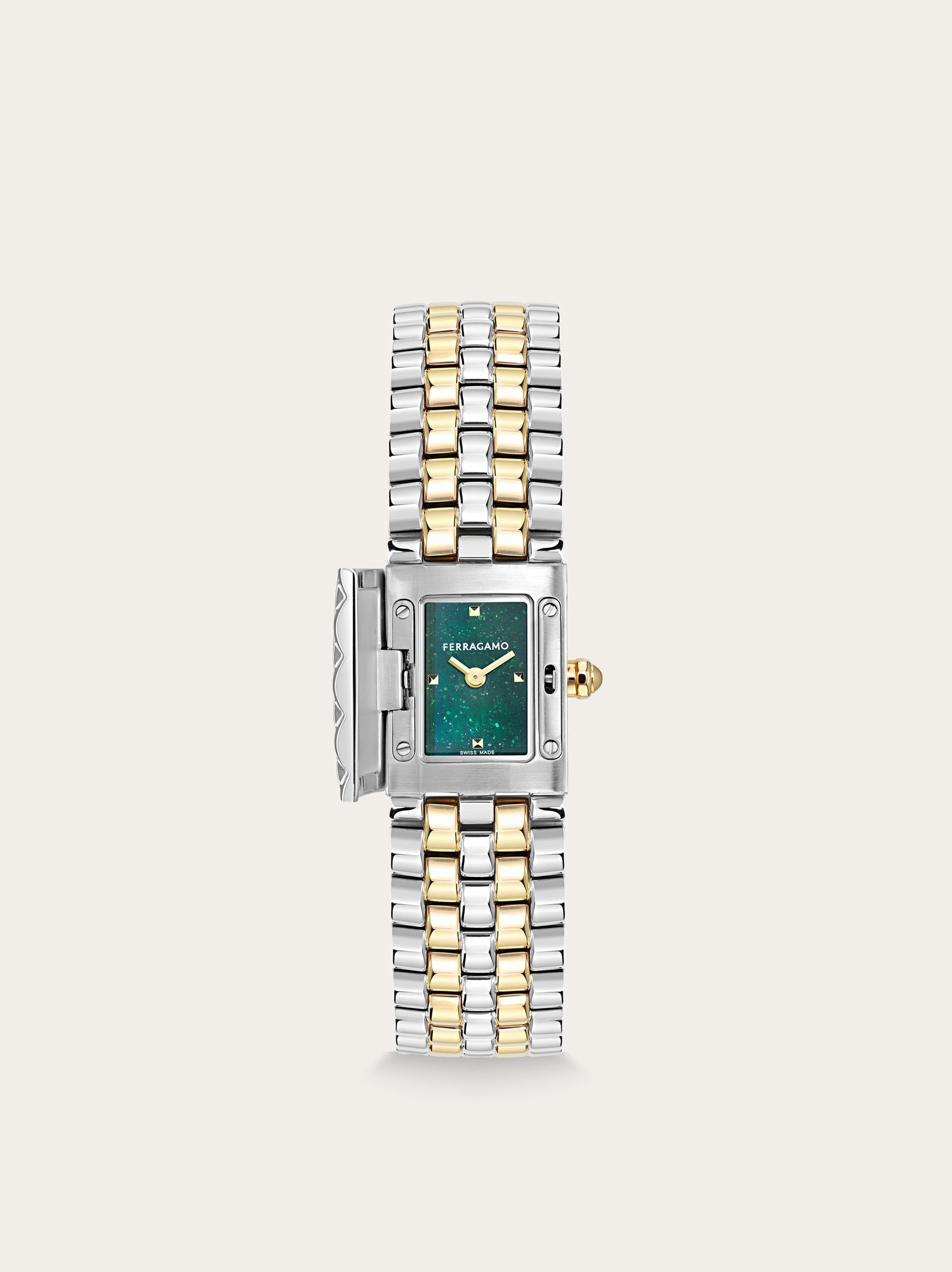 The Ferragamo Secret watch unveils its precious edition as a unique jewel. Crafted with artisanal charm, technical innovation, and aesthetic sophistication, it combines the functionality of an exceptional watch with the elegance of a luxurious accessory. At first glance, it appears as a bracelet, but with a gentle press on the top panel, it reveals a dial adorned with precious stones. Size: 18.5 x 30 mm Movement: RONDA 1032 - 2 hands quartz Case: Bico IPYG secret watch with Ferragamo logo on cover Dial: Green sandstone with metal studs Bracelet: Bico IPYG bracelet - Butterfly buckle with Ferragamo logo Glass: Sapphire crystal, anti-reflection, scratch-resistant WaterResistance: 30meters 2+2 Year Warranty Outer box, packaging, warranty and instruction booklet - Composition: Stainless steel case and bracelet - Made in SWISS - Product code: 611296 789402