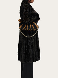Minimum fuss maximum impact. The clean cut silhouette of this new shoulder bag is pierced along the top by a Gancio pin that gathers the furry, soft ponyskin into voluptuous folds. Inspired by an archive design, this new fashion icon is decorated with a bold zebra pattern with an uptown attitude. - A) Height 9.6 IN B) Length 13.7 IN C) Width 4.7 IN - Composition: ponyskin - Handle drop: 10.2 in/26 cm - Medium - Made in ITALY - Product code: 219960 789758