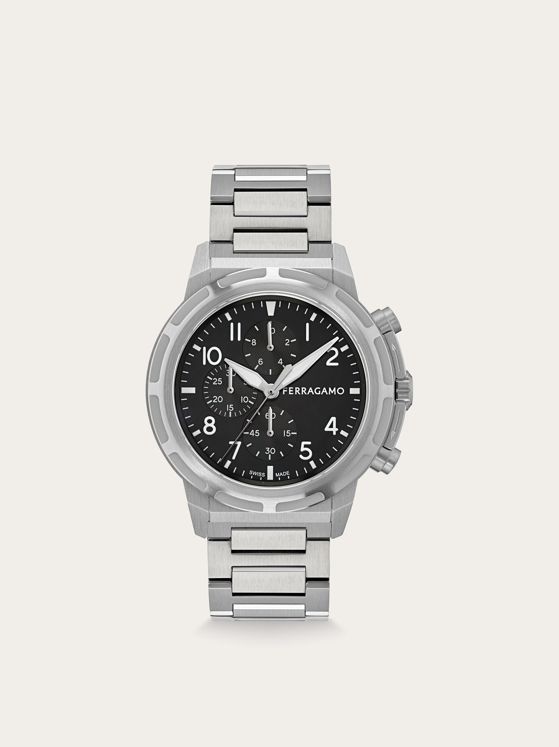 Introducing a dynamic new style in the sporty chronograph realm, the Ferragamo Sport Chrono boasts an energetic design inspired by pilot watches, tailored for modern trendsetters. This versatile, bold accessory embodies a sophisticated spirit and an adventurous vibe, making it perfect for any adventure. Size: 44 mm Movement: RONDA 3540D-Chrono Quartz Case: Stainless Steel - Crown with embossed “F” Dial: Black matte Bracelet: Stainless Steel bracelet - Butterfly buckle with Ferragamo logo Glass: Sapphire crystal, anti-reflection, scratch-resistant WaterResistance: 100 meters 2+2 Year Warranty Outer box, packaging, warranty and instruction booklet - Composition: Stainless Steel Case and Bracelet - Made in SWISS - Product code: 611320 784329