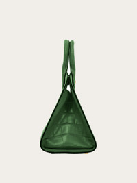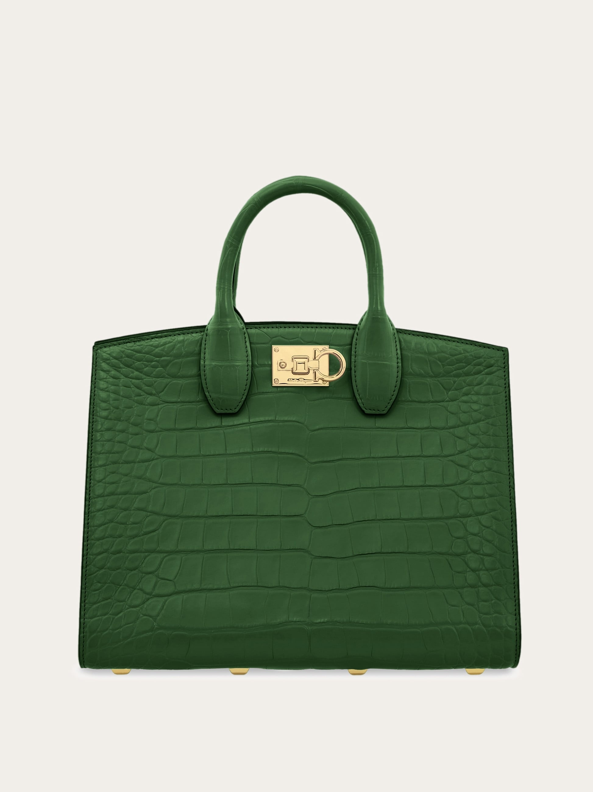 A coveted Brand icon: the Studio Box bag, in luxurious alligator leather for high-end glamor. This compact edition has a lined interior with flat pockets, and closes via a golden Gancini slider buckle. Golden studs protect the base, and a removable shoulder strap offers hands free styling. - A) Height 9.4 IN B) Length 11.0 IN C) Width 5.9 IN - Composition: alligator - Medium - Made in ITALY - Product code: 210990 781725