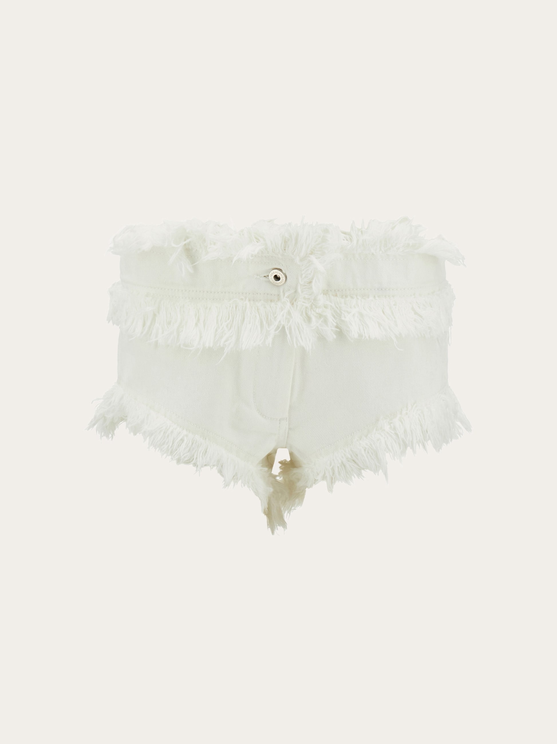 Frayed denim shorts with a high fashion feel. The play of overlapping frayed layers adds a dynamic twist to these cut offs that are designed to seriously flatter the female form. New contemporary femininity as dictated by Maximilian Davis. - Composition: 100% cotton - Model measurements: Height 5' 10"/178 cm; Bust 31½ "/80 cm; Waist 23½"/60 cm; Hips 34 "/88 cm - Model wearing: 38 - Made in ITALY - Product code: 13G948 782640