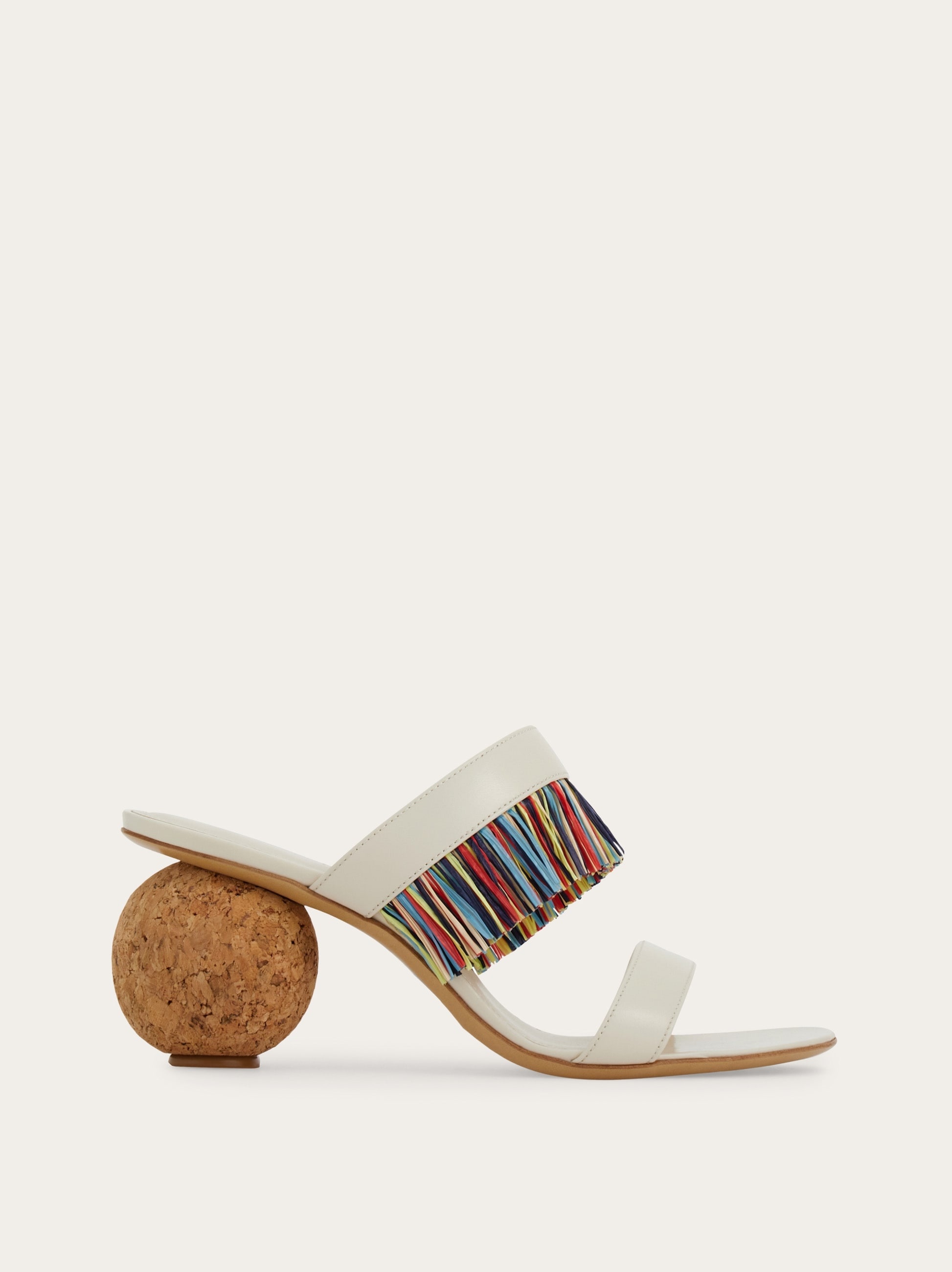 An exotic indulgence – this two-strap sandal is adorned with a feathery multicolored fringe across the vamp. The spherical heel is modeled on archival styles and carved from lightweight cork, which appears in multiple guises in the season's collection. Leather sole and non-slip heel tip. - Composition: nappa - Made in ITALY - Product code: 01K208 782677