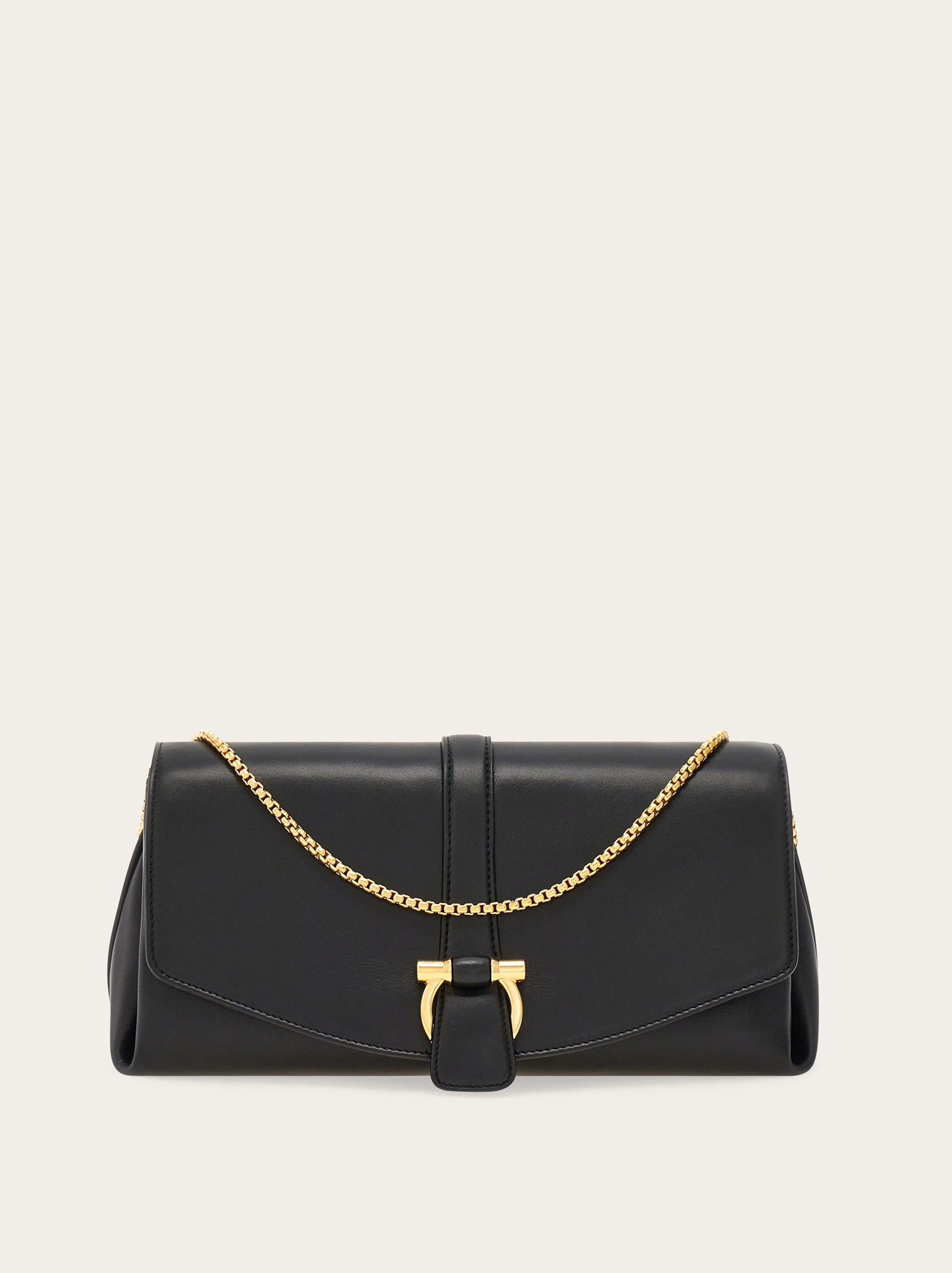 Effortlessly chic and easy to carry, this new Ferragamo cross body is a lesson in contemporary style. Cut from sumptuous Italian calfskin with a semi-gloss finish, the leather is punctuated by a golden Gancini clasp on the front flap. At the sides, custom golden tabs shape the bellows whose outline echoes the lily, the symbol of Florence. Carry as a clutch, shoulder bag or wear cross body with the adjustable, removable strap and golden chain. - A) Height 6.2 IN B) Length 12.2 IN C) Width 4.3 IN - Composition: calfskin - Small - Made in ITALY - Product code: 219794 777229