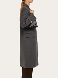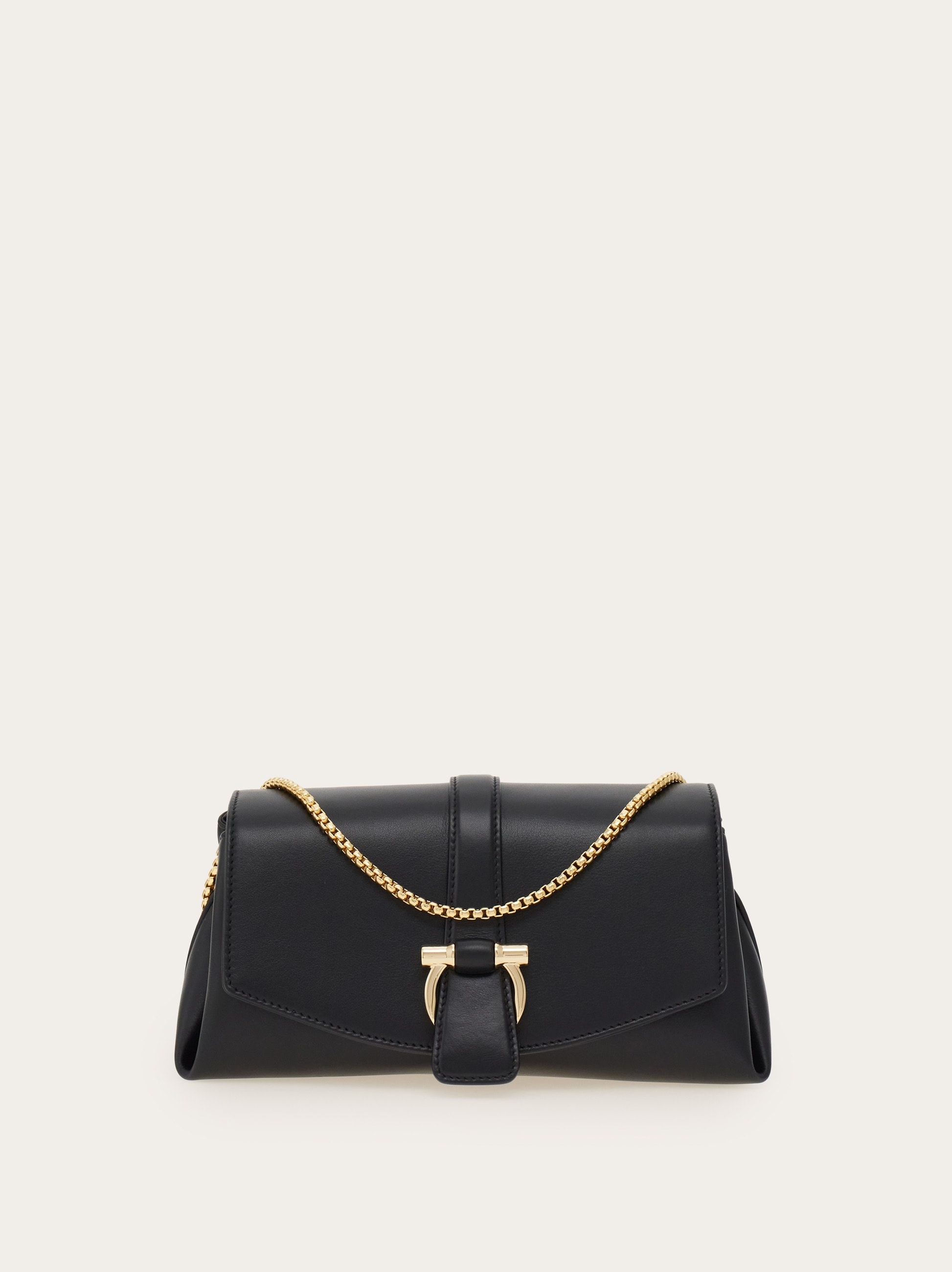 Compact, chic and easy to carry, this new Ferragamo cross body is a lesson in contemporary style. Cut from sumptuous Italian calfskin with a semi-gloss finish, the leather is punctuated by a golden Gancini clasp on the front flap. At the sides, custom golden tabs shape the bellows whose outline echoes the lily, the symbol of Florence. Carry as a clutch, shoulder bag or wear cross body with the adjustable, removable strap and golden chain. - A) Height 5.5 IN B) Length 10.2 IN C) Width 3.9 IN - Composition: calfskin - Extra Small - Made in ITALY - Product code: 219795 777233