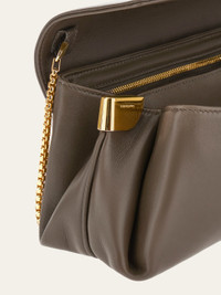 Sumptuous folds and rich calfskin leather characterize this new cross body bag by Ferragamo. Punctuated by a golden Gancini clasp on the front flap, and golden tabs that gather the side bellows, it can be carried as a clutch, worn cross body or over the shoulder via the interchangeable leather and metallic straps. - A) Height 5.5 IN B) Length 10.2 IN C) Width 3.9 IN - Composition: calfskin - Extra Small - Made in ITALY - Product code: 219795 787029