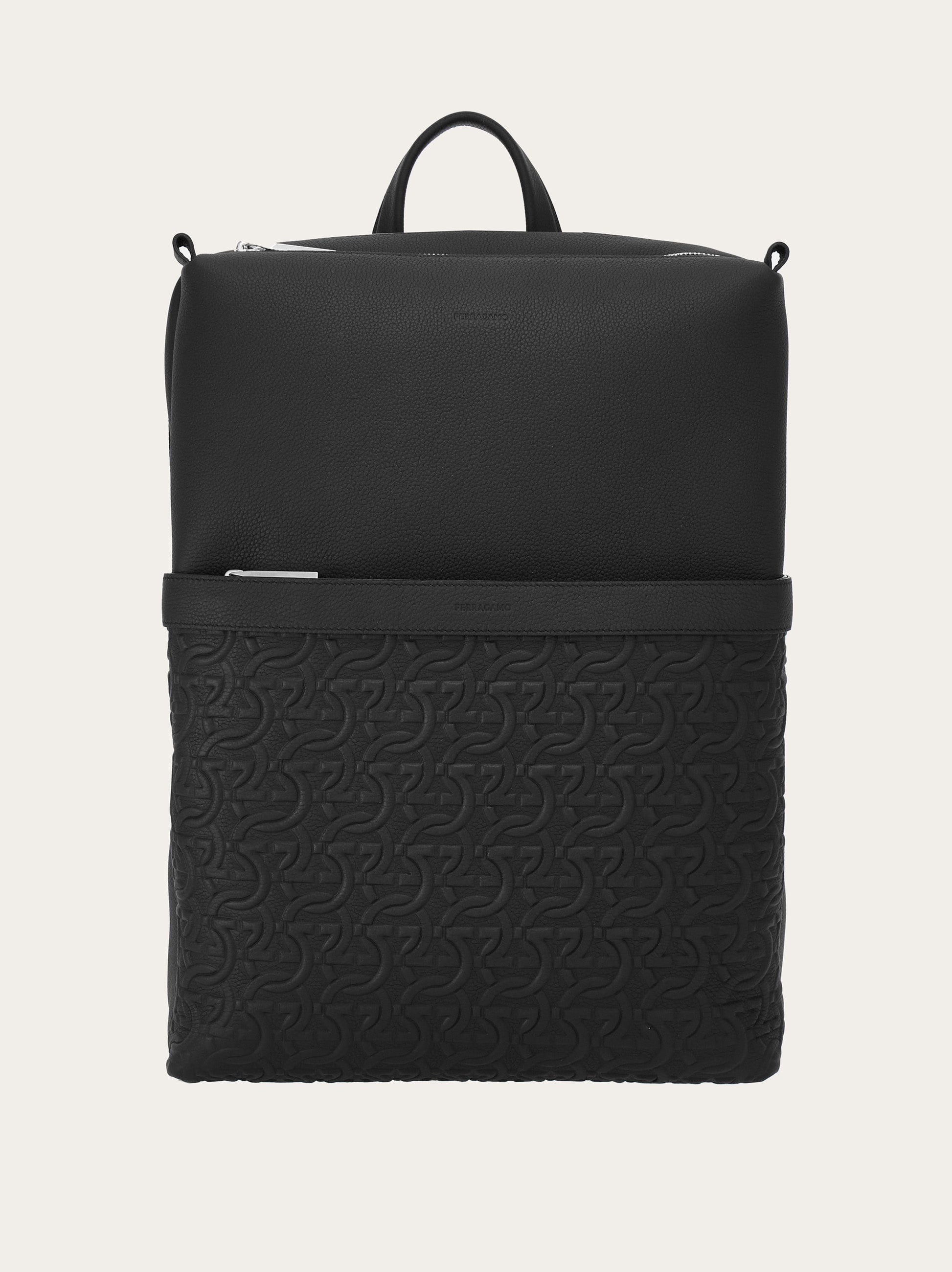 Hands-free urban mobility: new soft and exquisite hammered calfskin backpack adorned with a Gancini-embossed front panel. The construction is extremely functional with a large, organized compartment on the interior with space for electronic devices. The zipped front pockets of different sizes ensure space for all your personal belongings. The back pad and straps come in breathable padded technical fabric, paired with a strap for securing the backpack to a trolley. - height 15.7 IN length 11.4 IN width 5.1 IN - Composition: embossed and hammered calfskin - Made in ITALY - Product code: 241475 769505