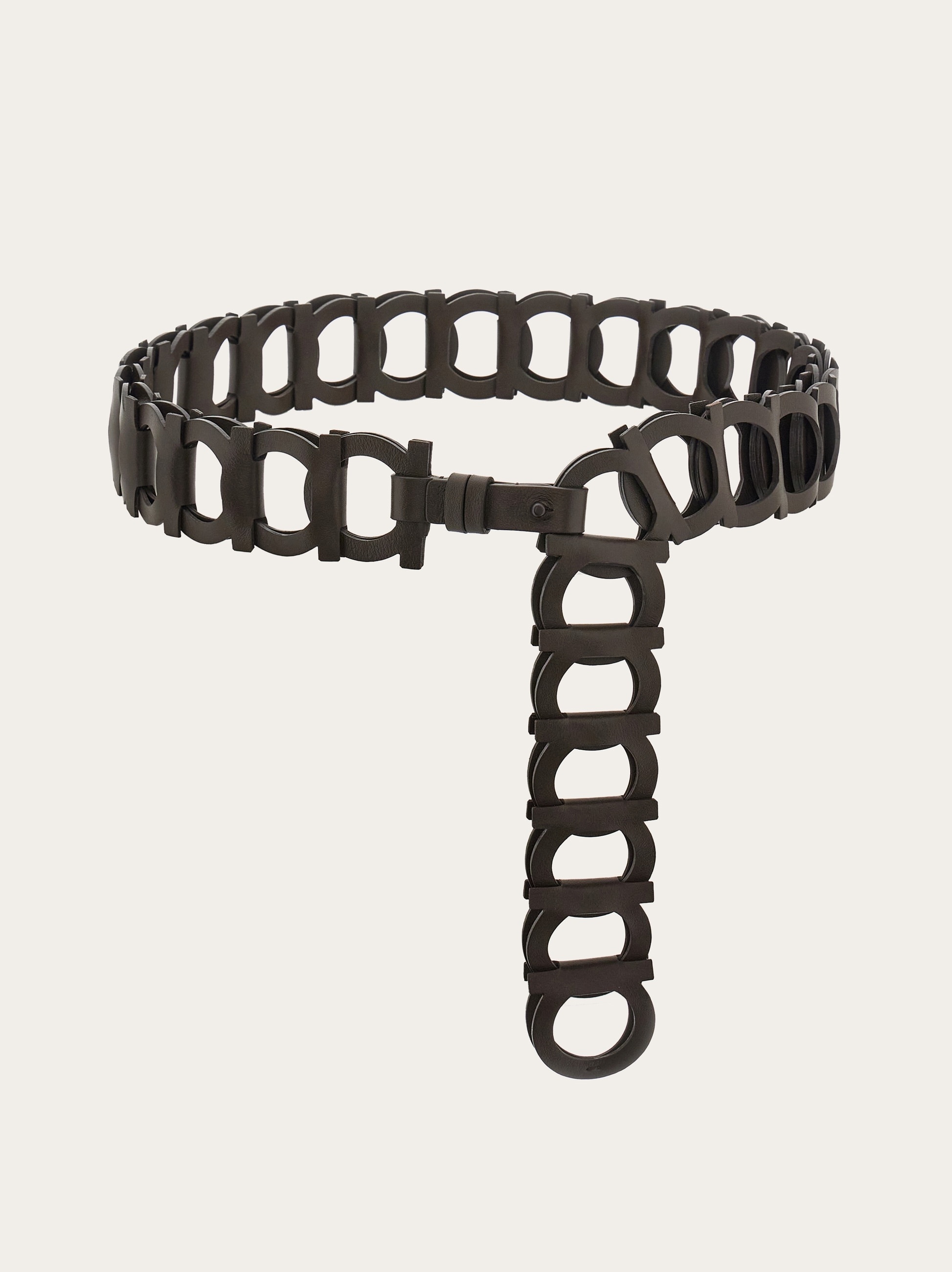 Iconic shapes interpreted with avant-garde craftsmanship define this new belt. It is composed of a chain of double-layered, lasered and intertwined Gancini. - height 1.7 IN - Composition: calfskin - Made in ITALY - Product code: 230416 784060