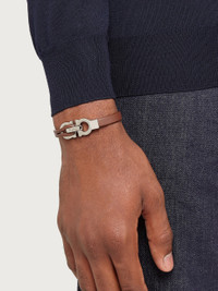 Essential style, minimal chic. Leather bracelet with a simple string and an iconic silhouette for the clasp: two matching Gancini are crossed by a leather knot, creating and asymmetrical, sophisticated flavor. Max length 17cm. - Composition: calfskin and brass - Size 17 - Made in ITALY - Product code: 774547 676055