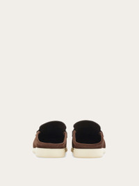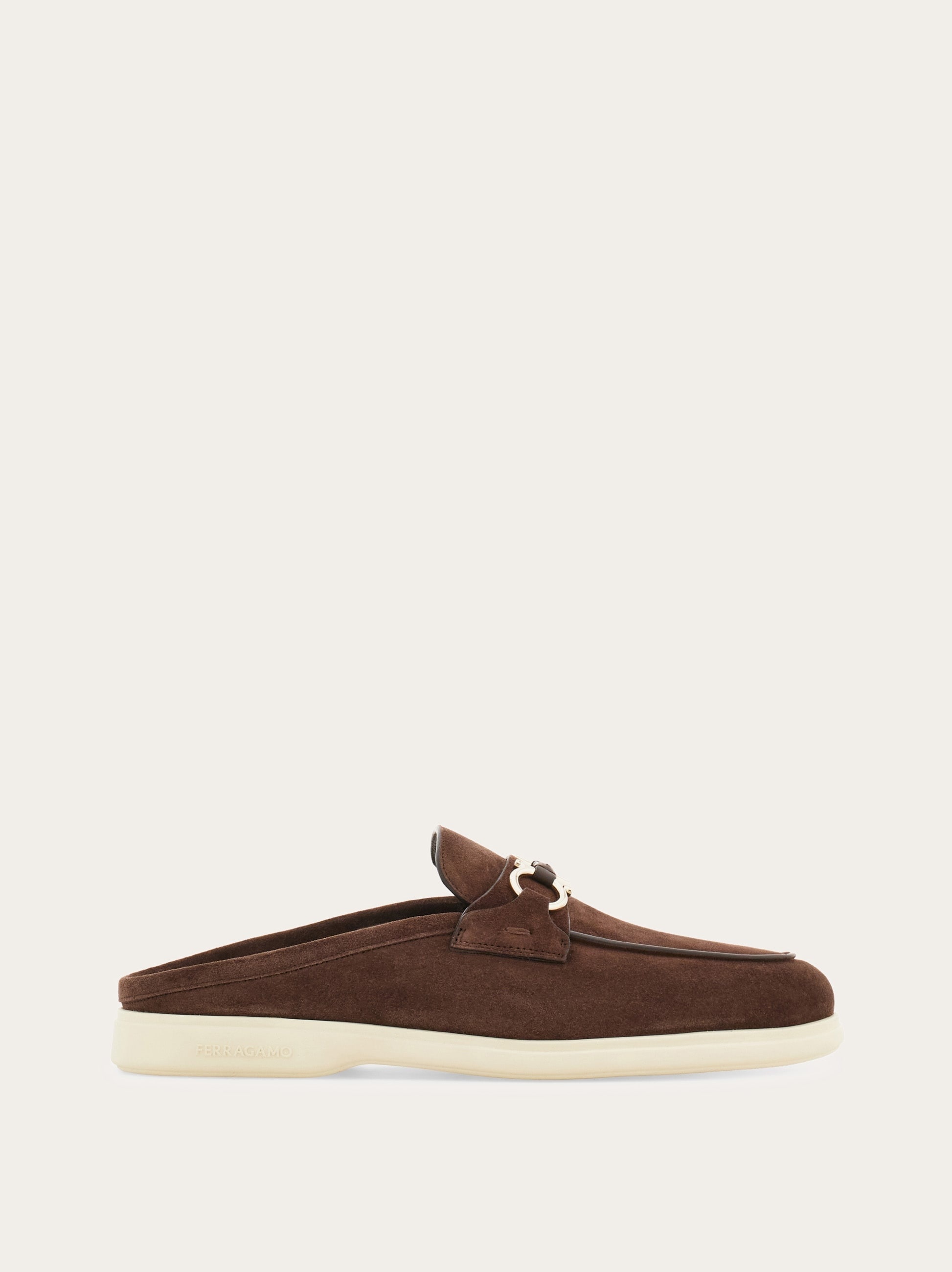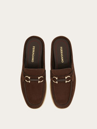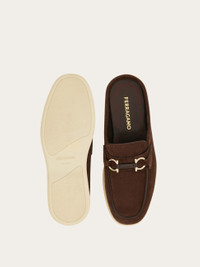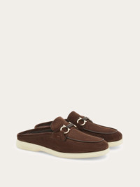 This new summer mule combines an effortless backless profile with elements inspired by classic loafers. It has a softly squared toe and the titanium-tone Gancini buckle enriched with leather detailing. Flexible rubber sole with logo. - Composition: suede calfskin - Made in ITALY - Product code: 029583 783795